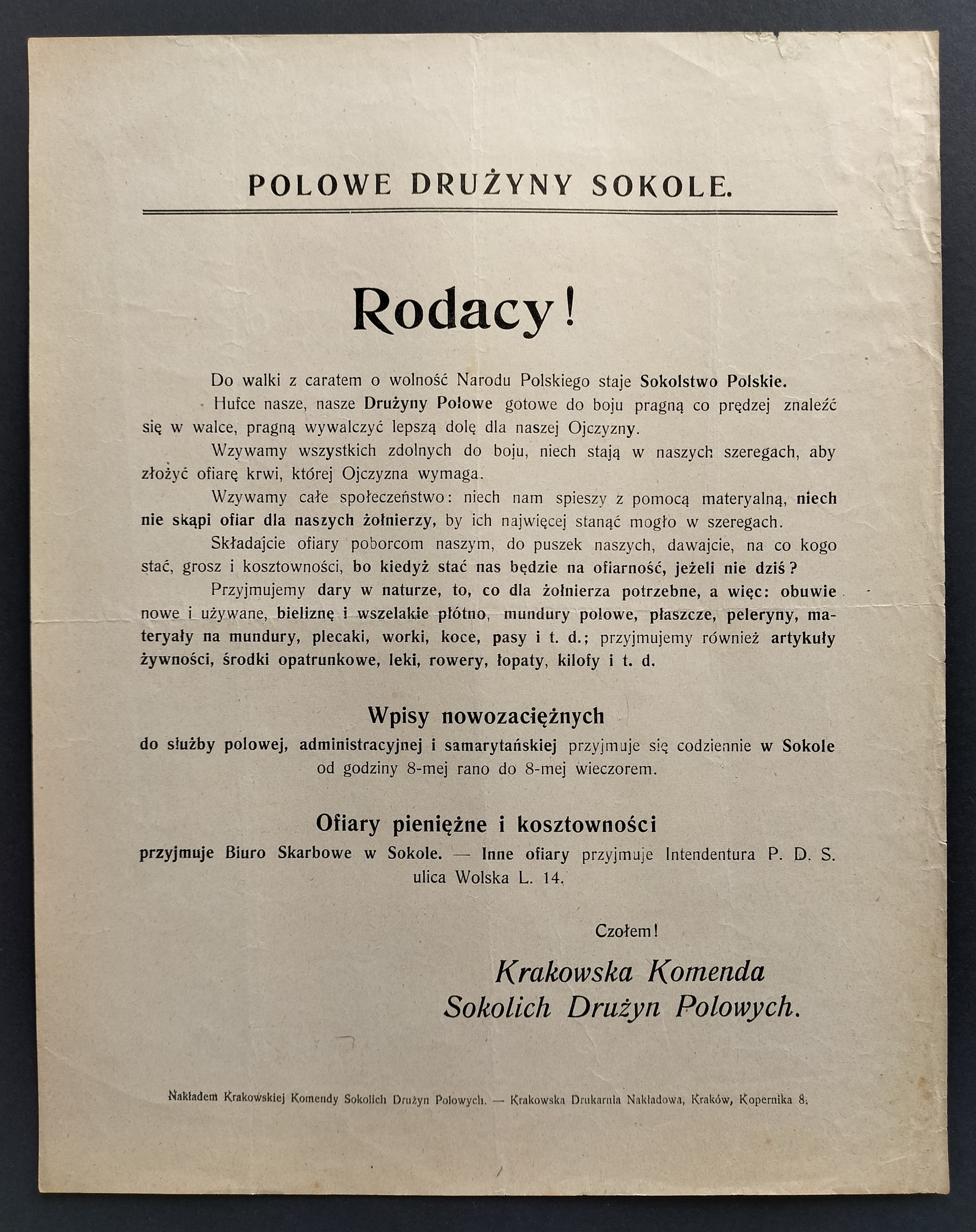 Stałe Drużyny Sokole - Wojna rosyjsko-japońska z lat 1904-1905 i będąca jej następstwem rewolucja, która objęła Cesarstwo Rosyjskie, skłoniła kierownictwo „Sokoła” w Krakowie, aby w ramach gniazda powołać w 1906 roku Organizację Członków Umundurowanych. Zrzeszonych w niej druhów podzielono na oddziały, poddano dyscyplinie i ćwiczono w musztrze. Od tej pory mieli oni być stale w gotowości do realizowania zadań postawionych przed nimi przez władze sokole. W roku 1912 Zarząd Związku wezwał gniazda do tworzenia Stałych Drużyn Sokolich. Ich regulamin przyjęto na posiedzeniu Wydziału Związku w dniu 10 grudnia 1912 roku. Drużyny liczyły przeciętnie 129-165 druhów i miały składać się z 3 plutonów, a te z 3 zastępów. 3 drużyny tworzyły hufiec uzupełniany sztabem i służbami pomocniczymi, w tym druhnami po kursach samarytańskich. Komendantami SDS zostawali prezesi gniazd, a bezpośrednimi dowódcami naczelnicy. Dla sfinansowania wyposażenia drużyn utworzono specjalny fundusz pod nazwą Skarb Sokoli. Szacuje się, że przed I wojną światową osiągnęły one liczebność ponad 7 000 druhów. Komendantem SDS na poziomie Związku Sokolego został kpt. Józef Haller.