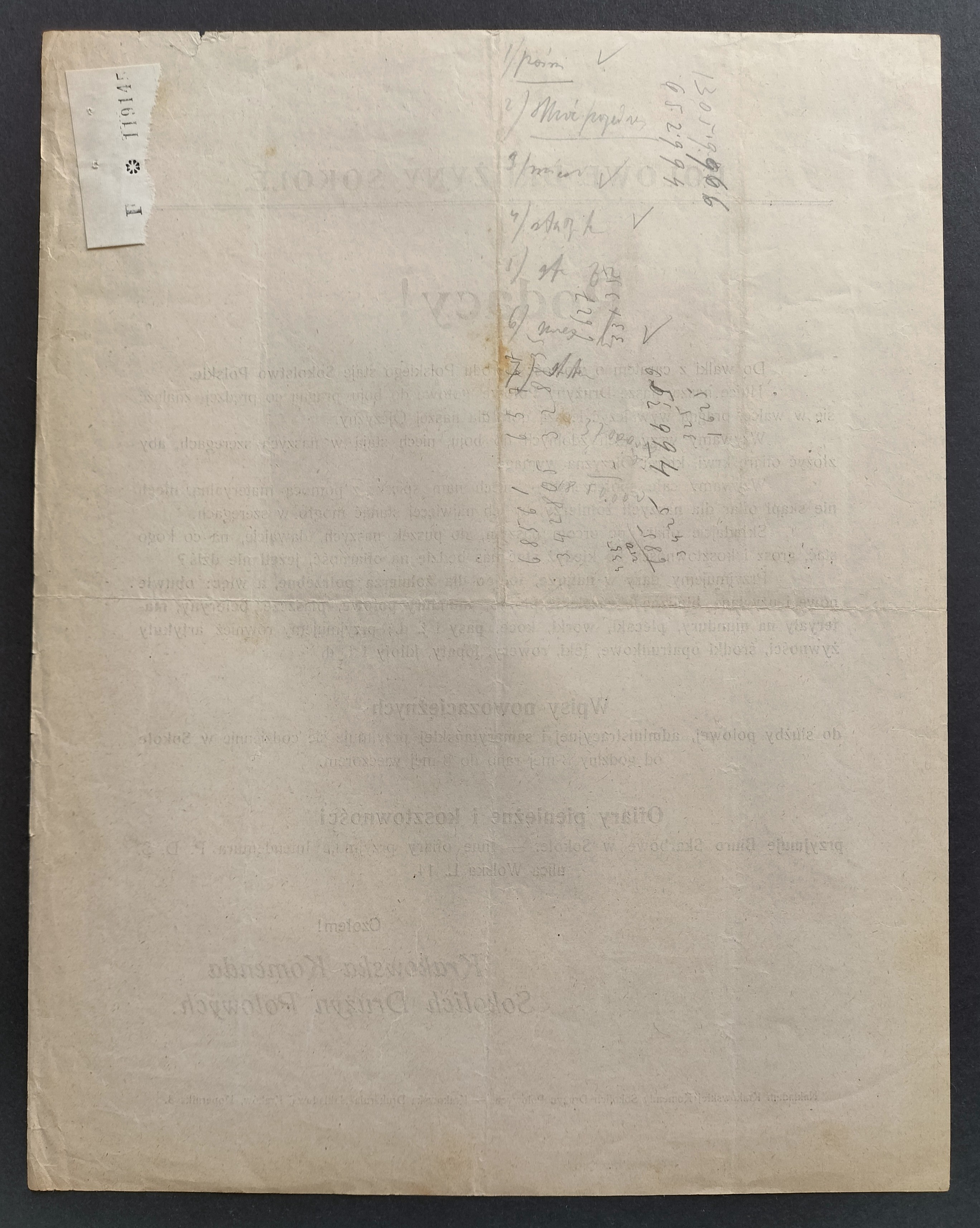Format:23x30cm. Na 2 stronie ulotki adnotacje ołówkiem.
