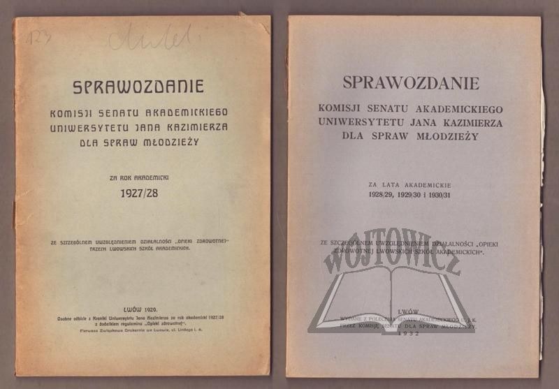 - oraz: Sprawozdanie Komisji Senatu Akademickiego Uniwersytetu Jana Kazimierza dla spraw młodzieży za lata akademickie 1928/29, 1929/30 i 1930/31. Ze szczególnym uwzględnieniem działalności "Opieki zdrowotnej lwowskich szkół akademickich". Lwów 1932. Wydane z polecenia Senatu Akademickiego U.J.K. przez Komisję Senatu dla Spraw Młodzieży. 8, s. 120, [2], tabele w tekście, skład. tabl., okł. brosz. wydaw.