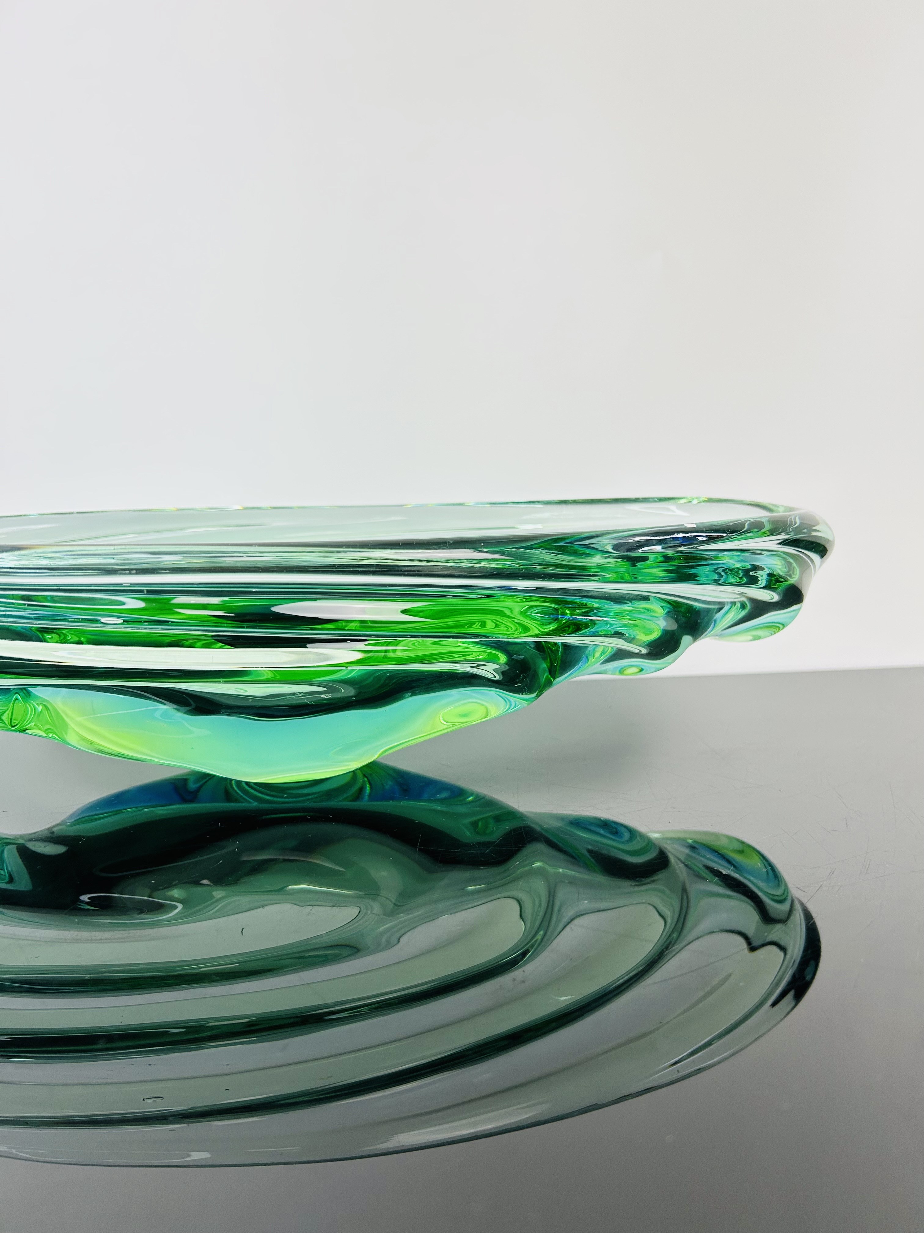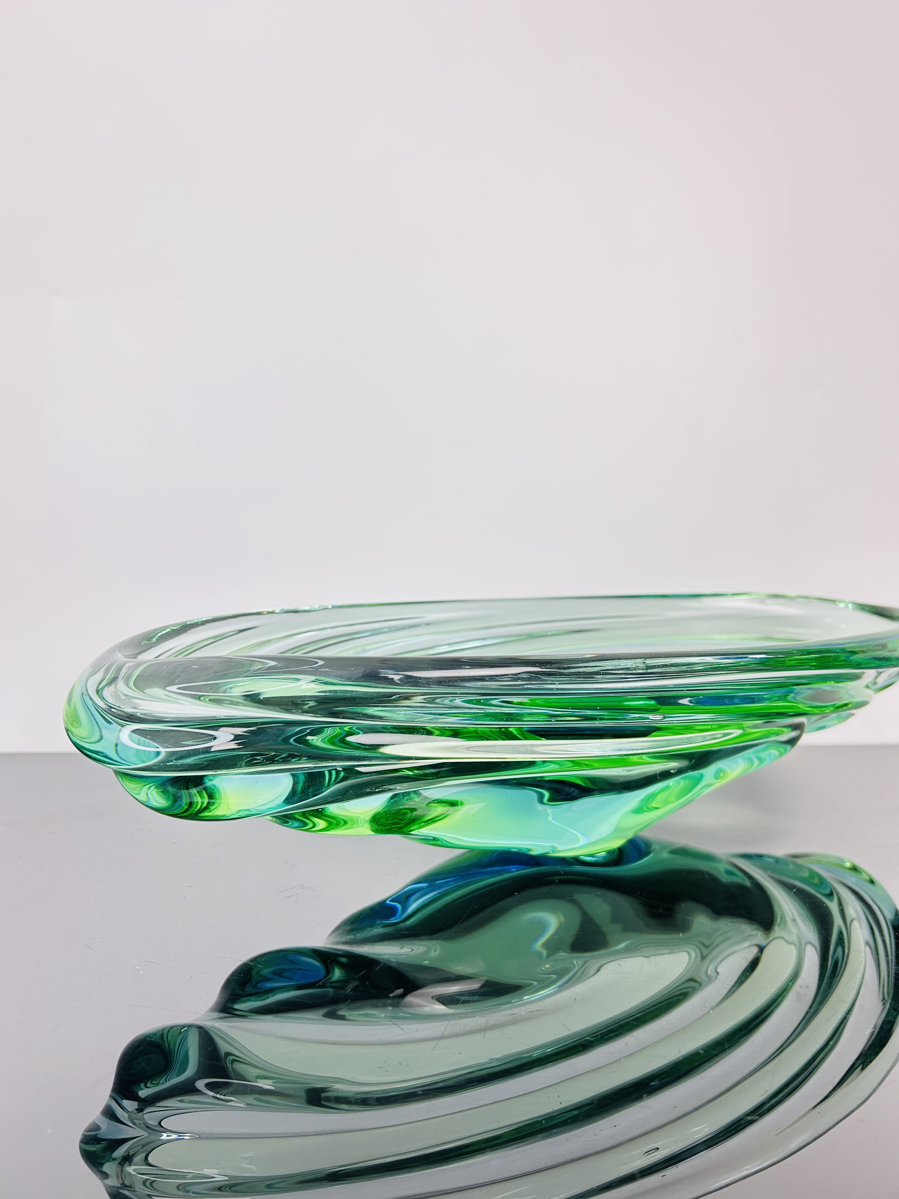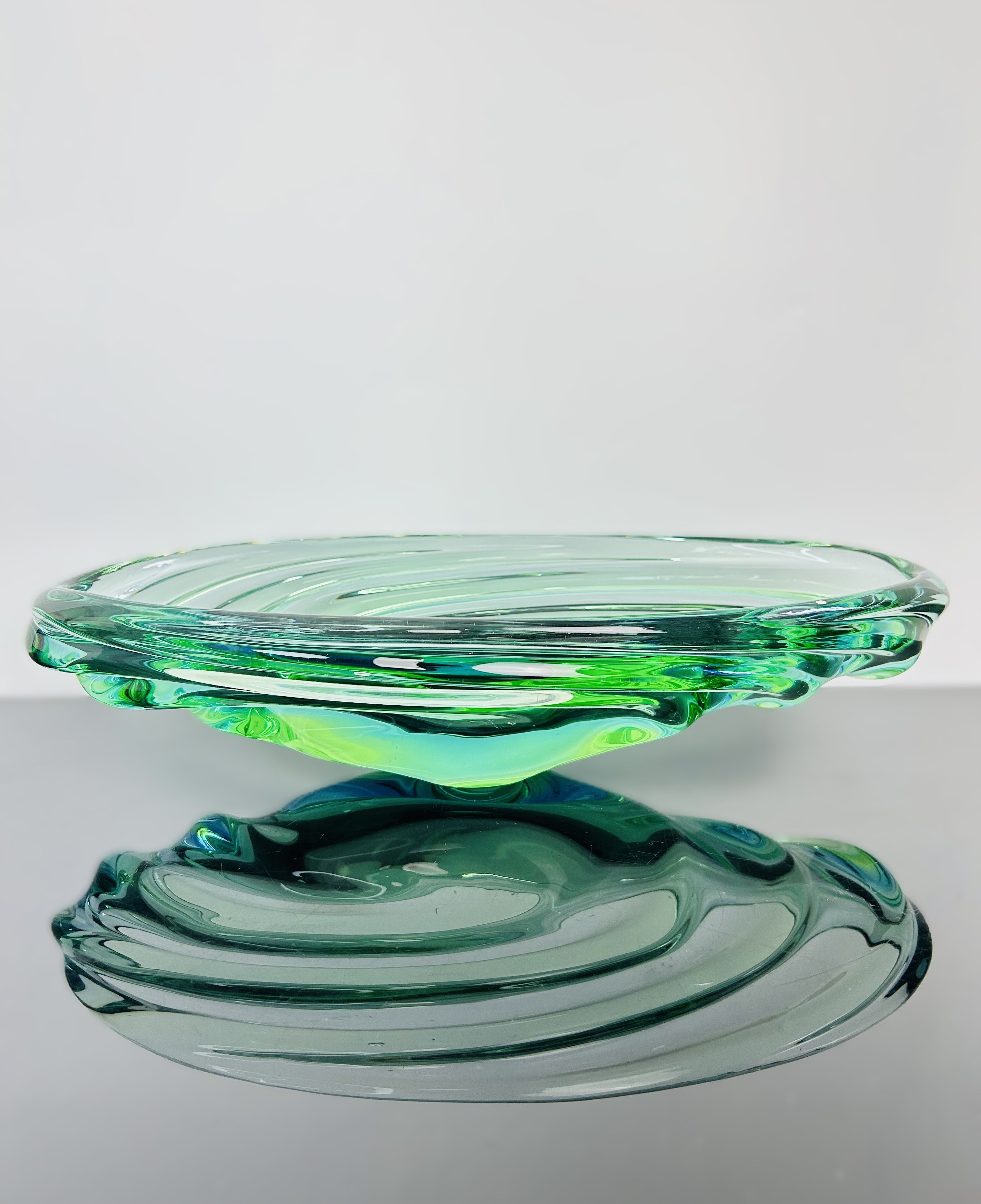 This exceptional mid-century bowl, created by master glass designer Jaroslav Beránek, belongs to the Andromeda collection produced in Škrdlovice around 1955. Made using the sommerso technique, it combines layered uranium glass with thick crystal casing, creating striking optical depth and vibrant green glow under UV light.