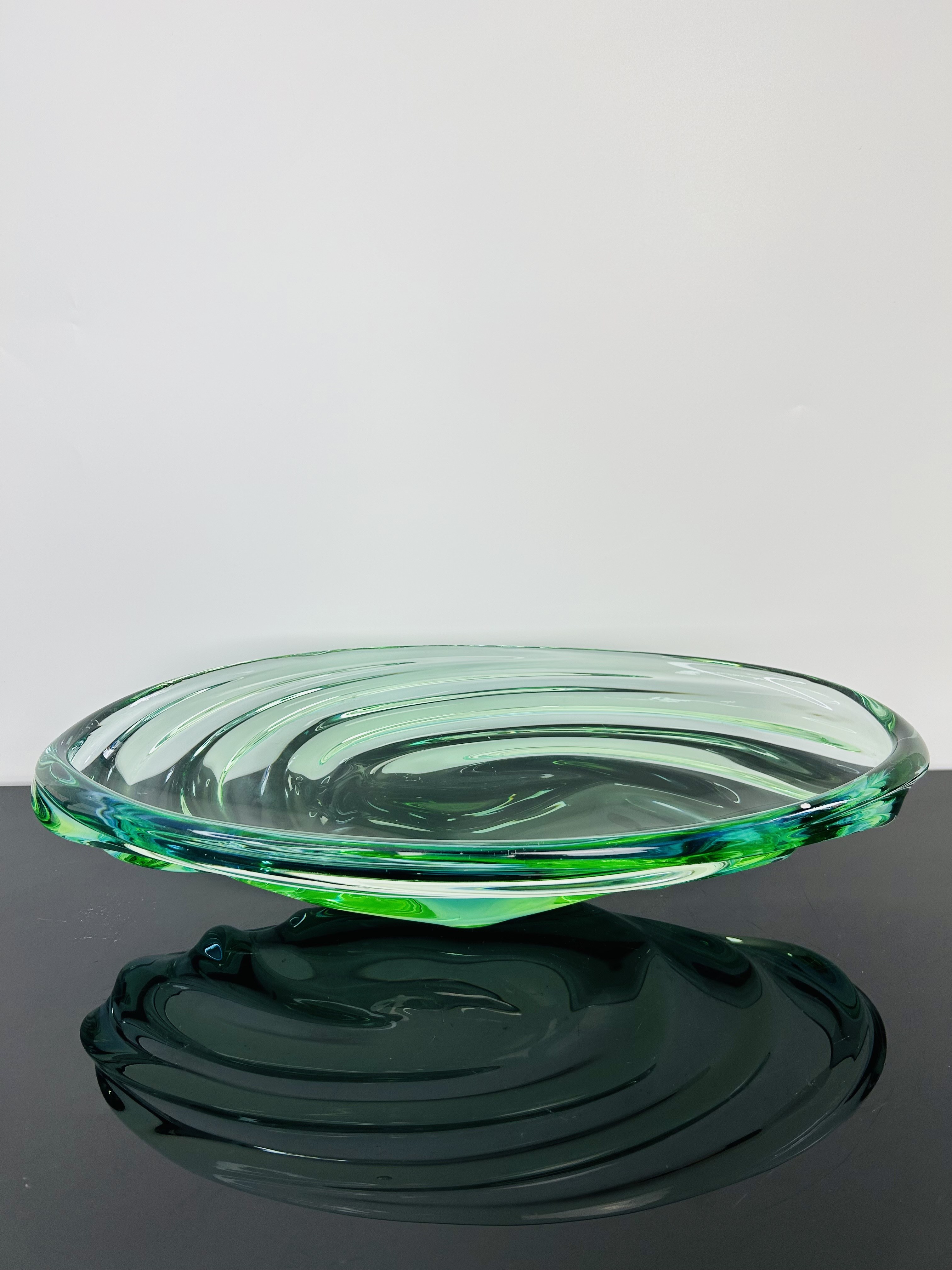 The bowl’s substantial weight and sculptural form exemplify the bold aesthetics of 1960s Czechoslovakian glassmaking. As both a decorative centerpiece and a historical collectible, it reflects the pioneering artistry of Škrdlovice’s early postwar production. Rare, powerful, and highly desirable among collectors of Bohemian uranium glass.
