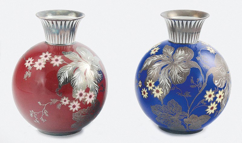 Wazony o kulistych brzuścach, z lekko kielichową szyjką; na szafirowym lub ceglasto- czerwonym tle brzuśców nałożona srebrzeniem galwanicznym gałązka z dwoma kwiatami irysa i gałązki drobnych kwiatków -gwiazdek; wokół szyjek szlak smukłych romboidalnych listew, wewnętrzne brzegi szyjek srebrzone.