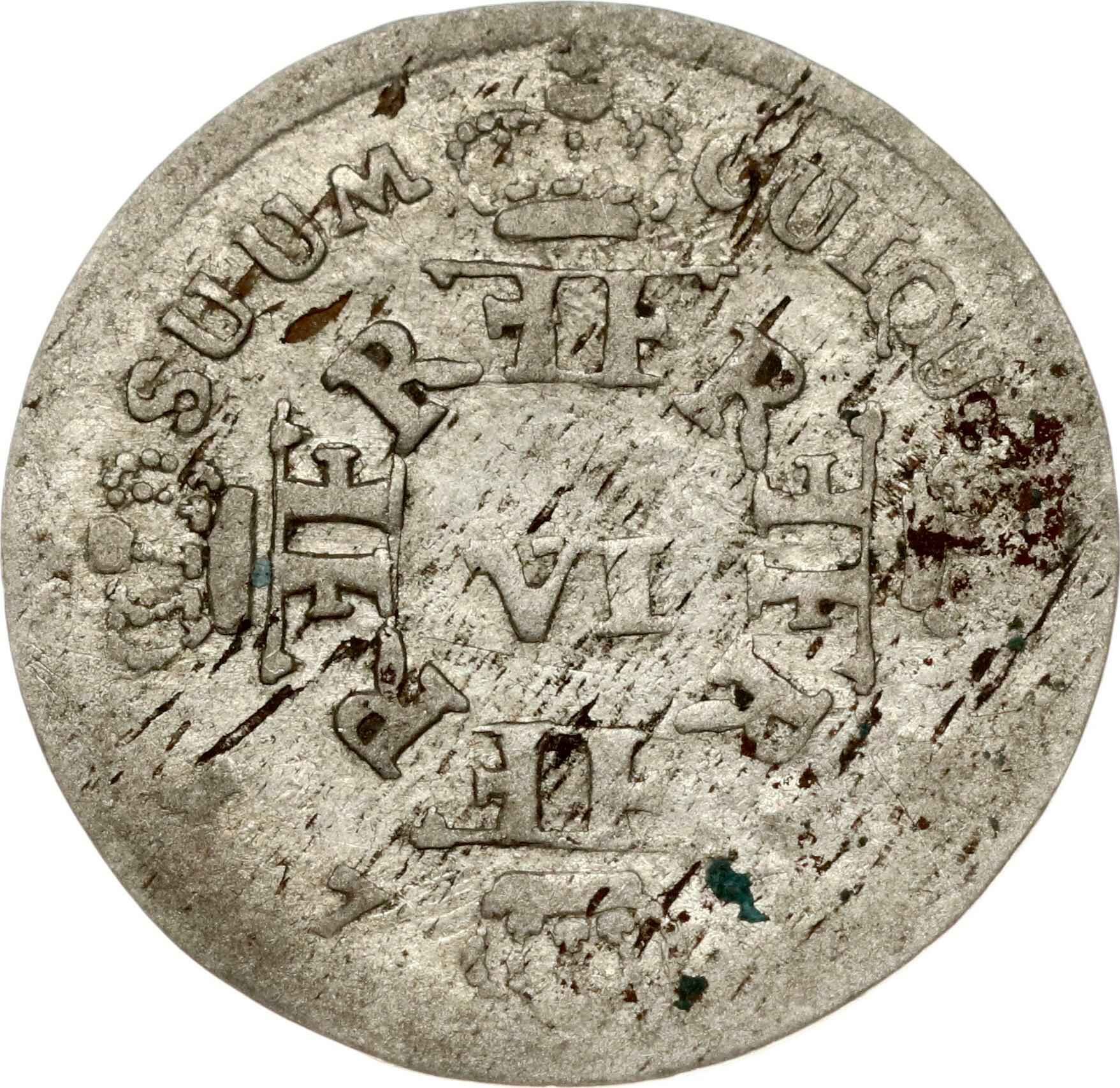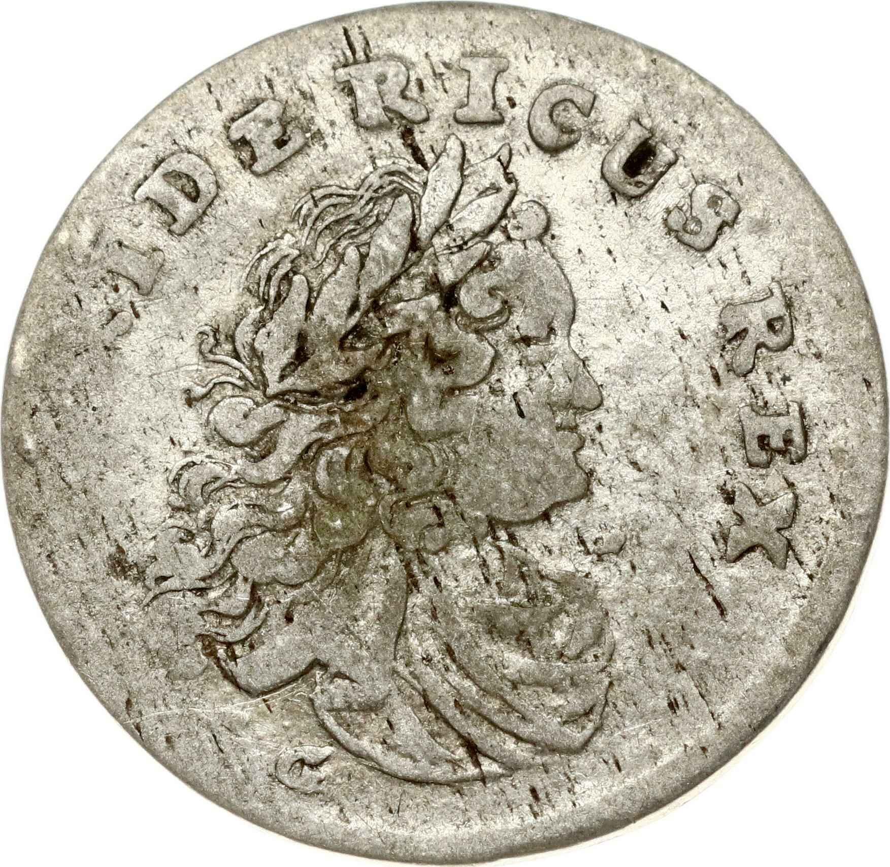 Germany Prussia 6 Groscher 1704 CG Friedrich I (1701-1713). Obverse: Laureate and draped bust facing right. Mintmasters initials below. Lettering: FRIDERICUS REX C G. Reverse: Four crowned double-F monograms alternating with 4 R's; value 'VI' in center; legend divided above; date divided at bottom. Lettering: SUUM CUIQUE VI 17 04. Edge Smooth. Silver. Slight surface damage. KM 429