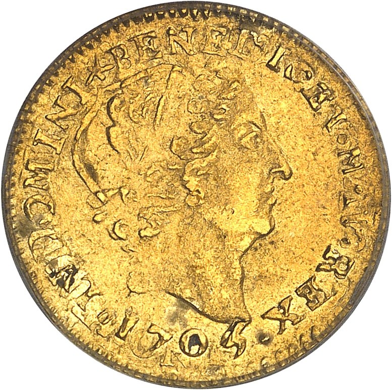Louis XIV (1643-1715). Demi-louis d’or aux insignes, réformation 1705, S, Reims. PCGS MS60 (3556102).