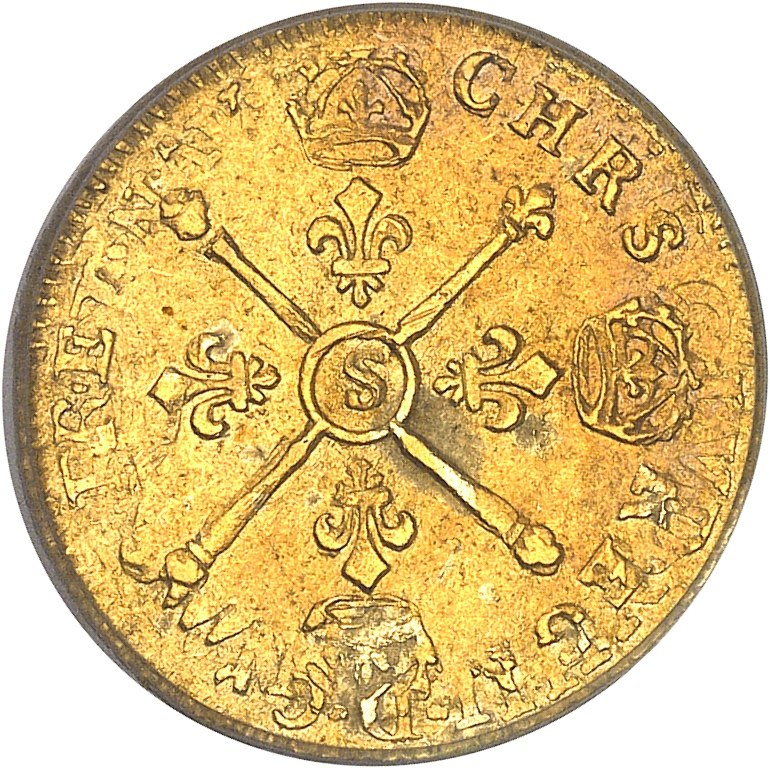 Rv. CHRS. REGN. VINC. IMP (différent). Croix formée de quatre lis couronnés, avec (atelier) dans un cercle en cœur, brochant sur une main de justice et un sceptre posés en sautoir.