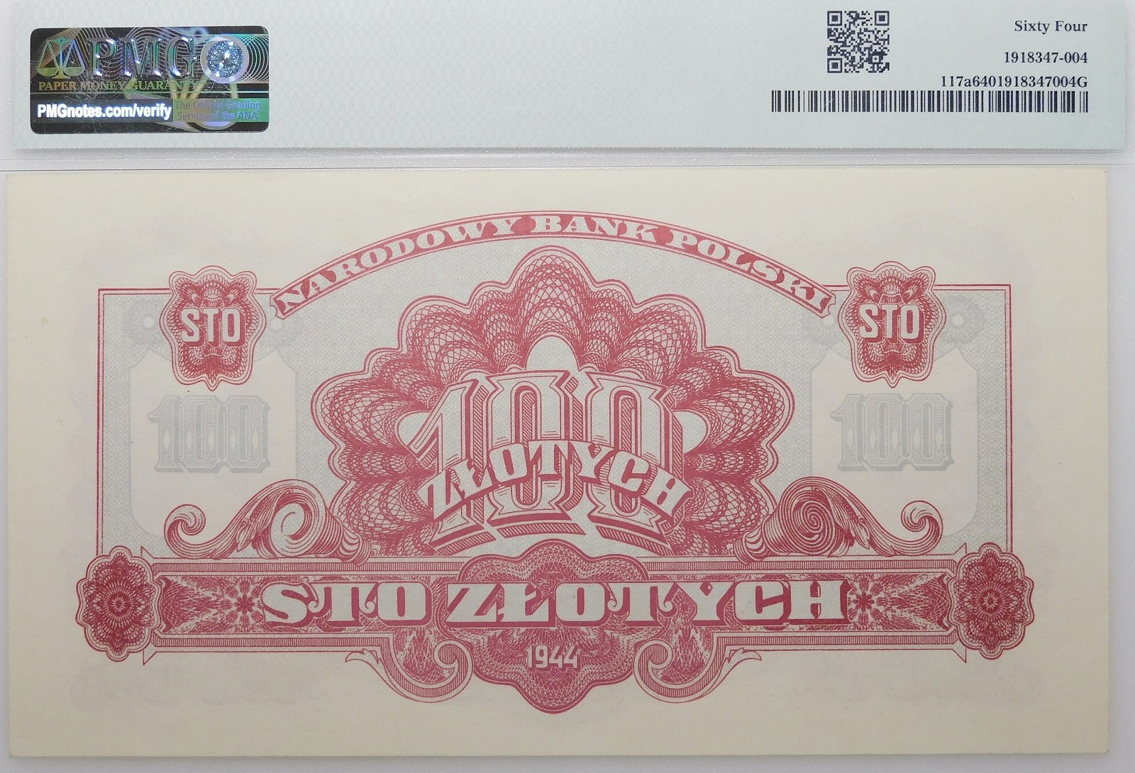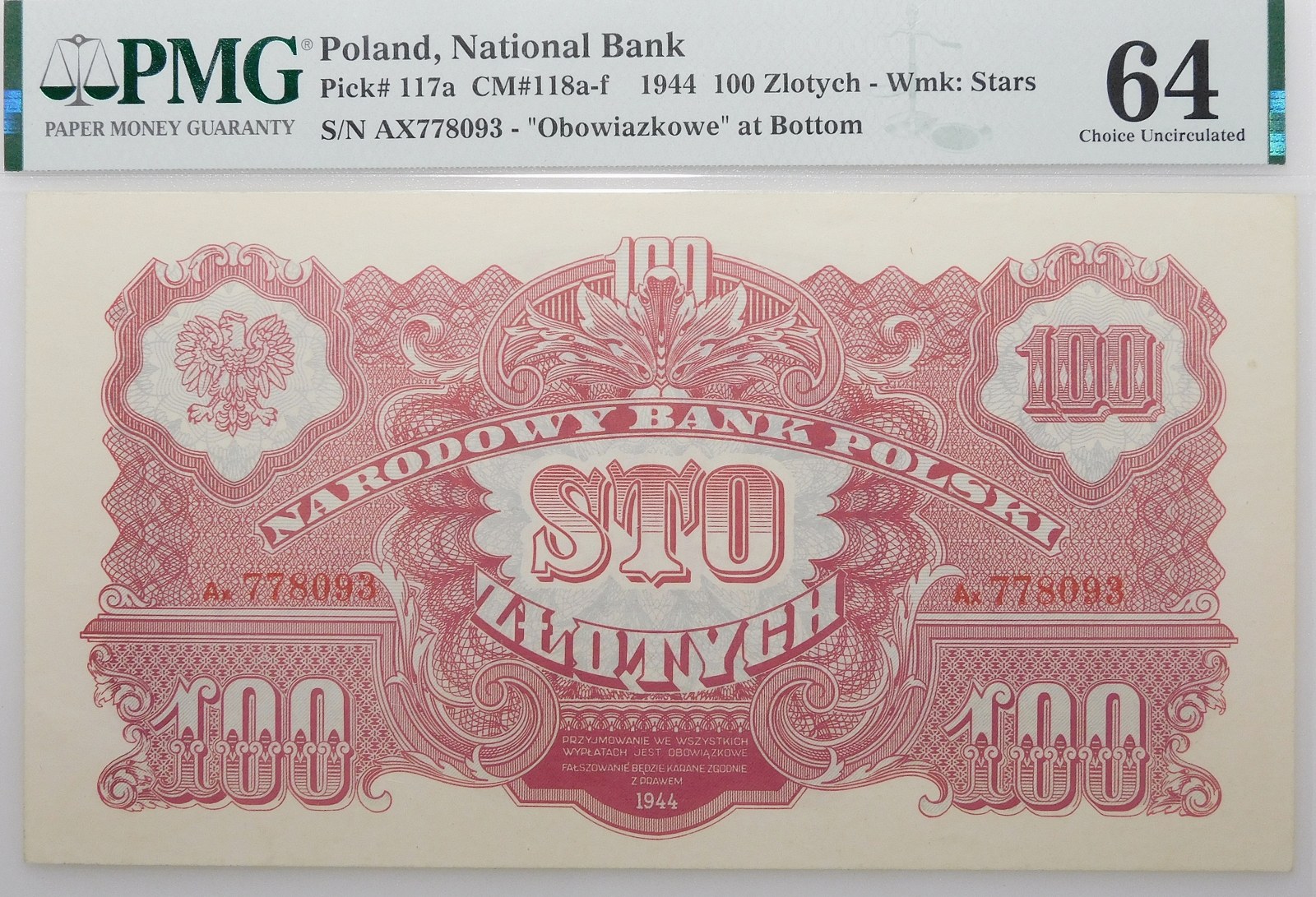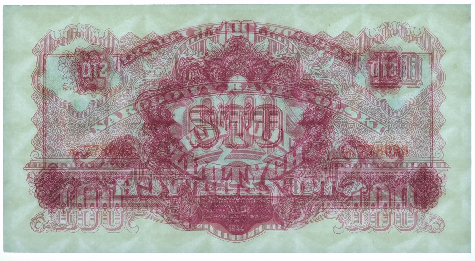 Banknot 100 złotych 1944 emisji lubelskiej, ser. Ax , odmiana z klauzulą "... obowiązkowe".