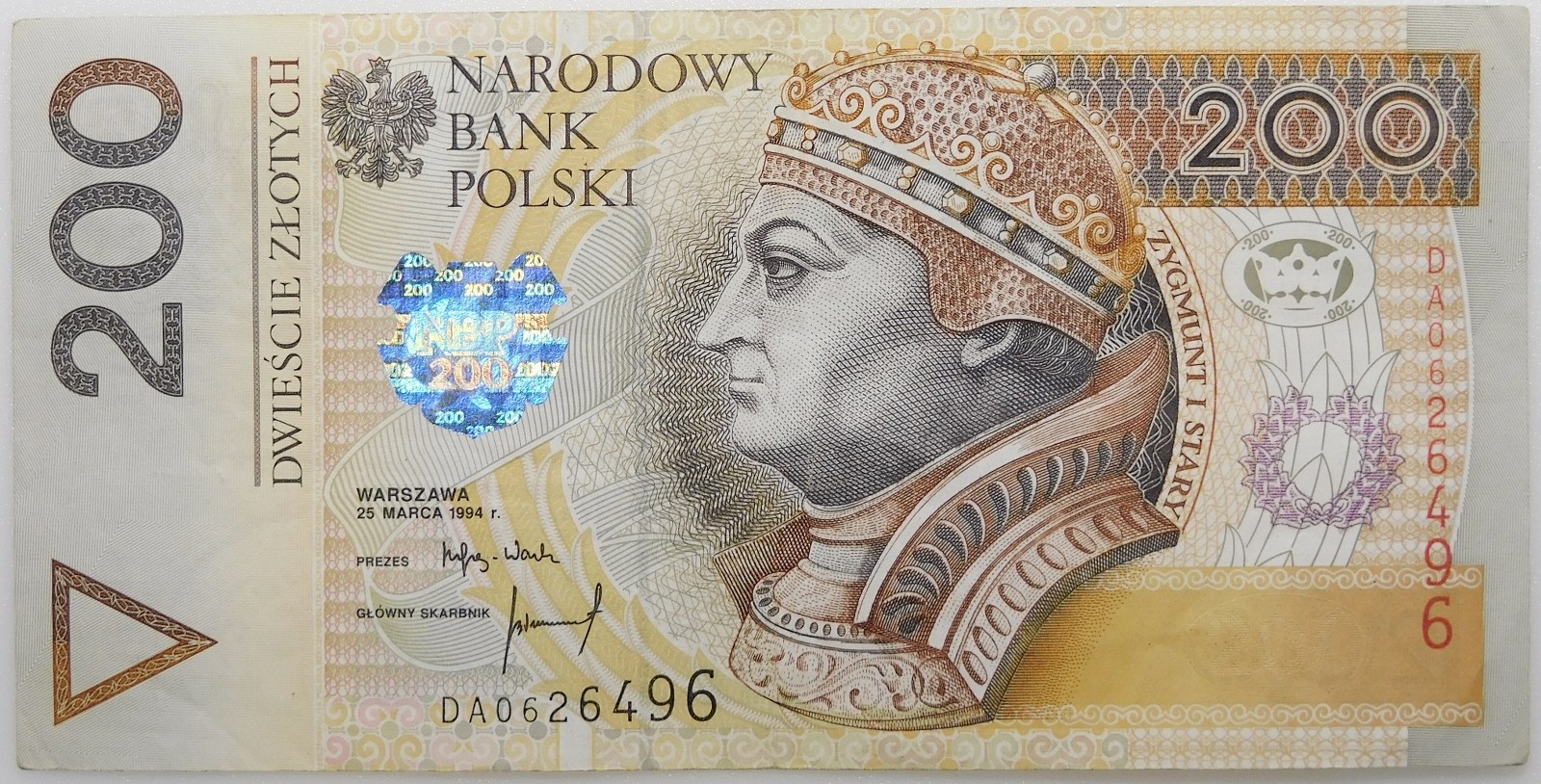 Banknot 200 złotych 1994, ser. DA - pierwszy druk w PWPW