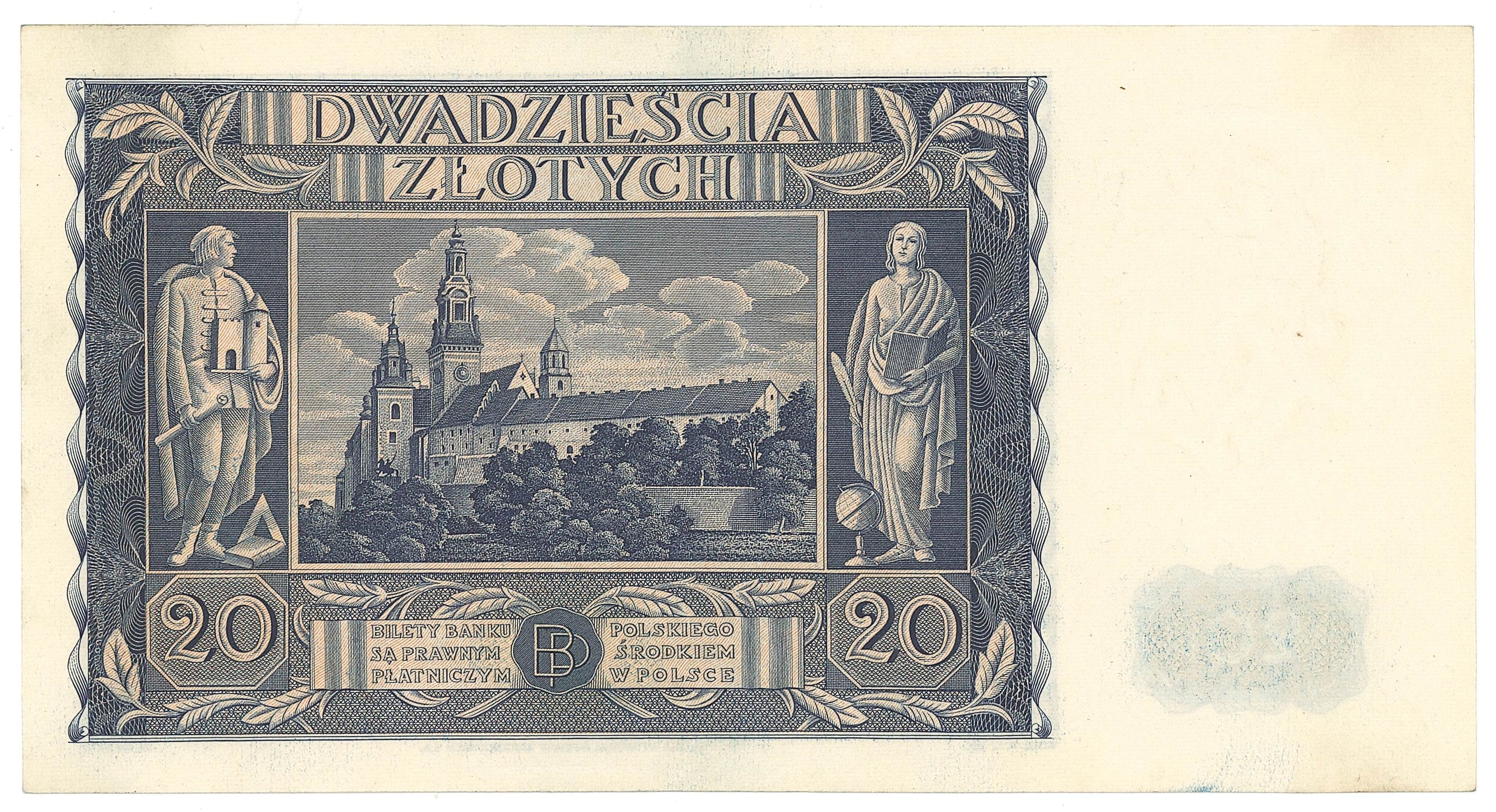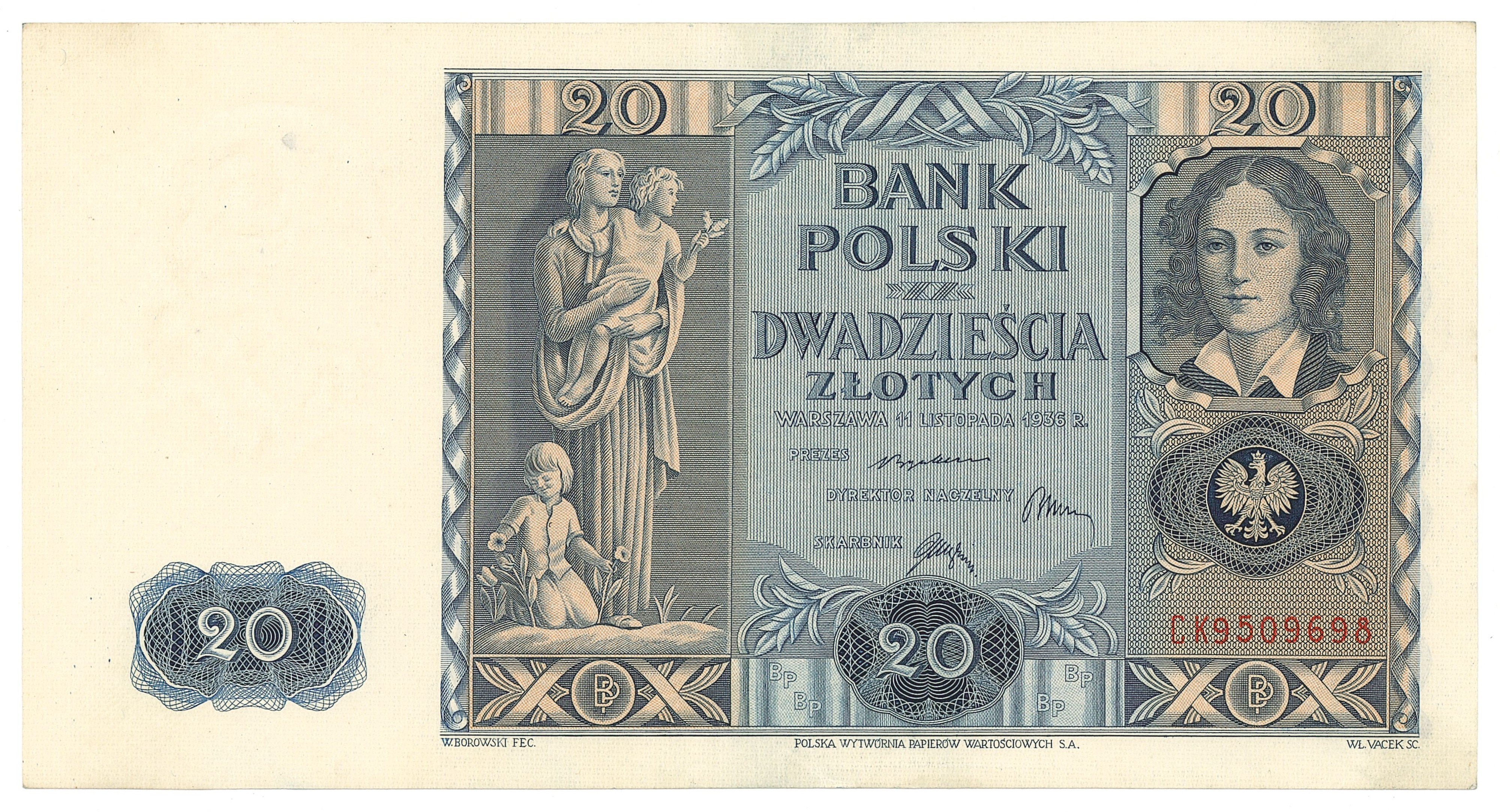 Banknot autorstwa Wacława Borowskiego, znak wodny w niezadrukowanym polu wizerunek Emilii Plater z profilu.