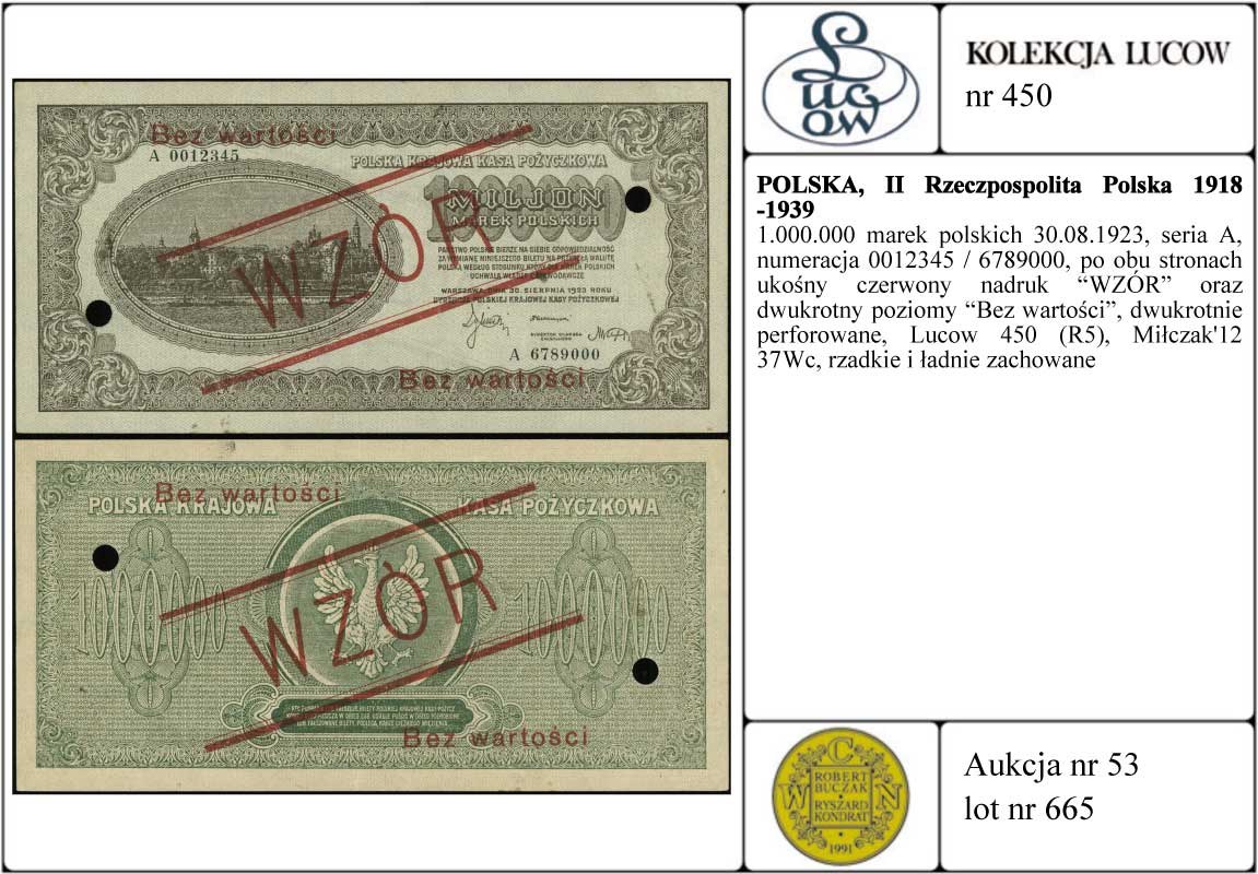 II Rzeczpospolita Polska 1918-1939, 1.000.000 marek polskich 30.08.1923, seria A, numeracja 0012345 / 6789000, po obu stronach ukośny czerwony nadruk WZÓR oraz dwukrotny poziomy Bez wartości, dwukrotnie perforowane, Lucow 450 (R5), Miłczak'12 37Wc, rzadkie i ładnie zachowane
