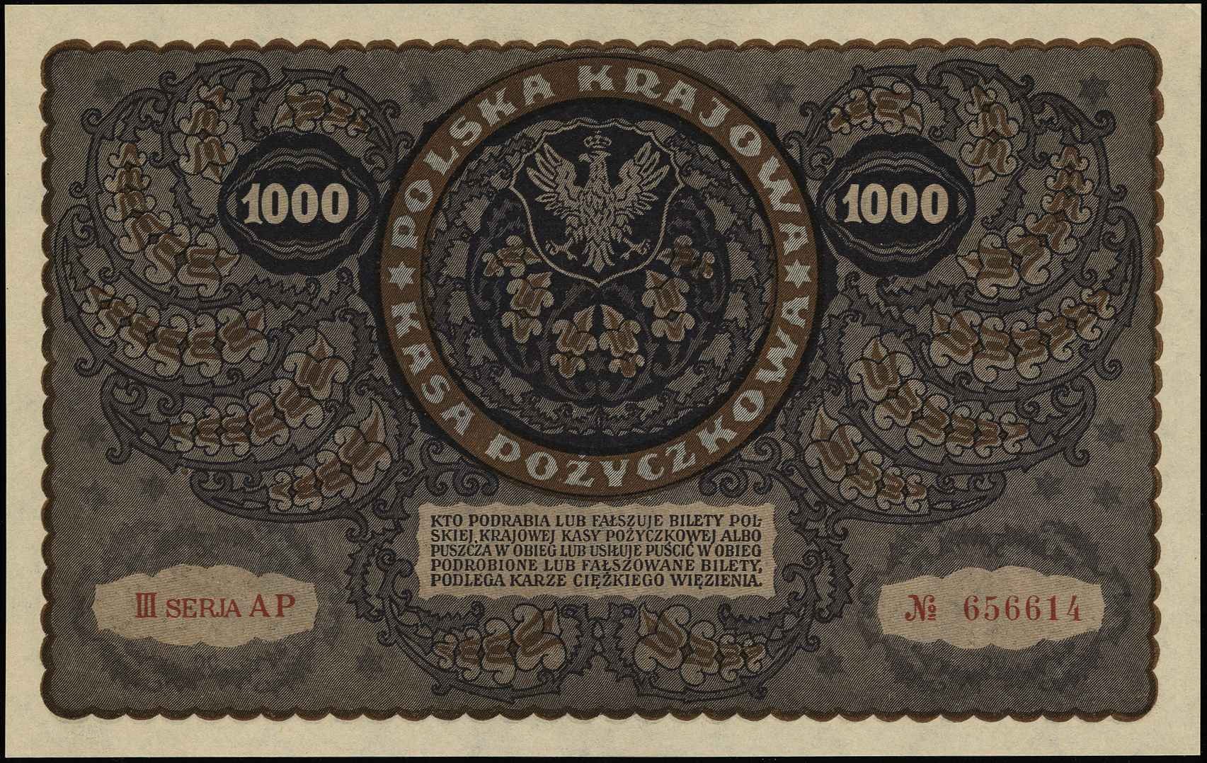 II Rzeczpospolita Polska 1918-1939, 1.000 marek polskich 23.08.1919, III seria AP, Miłczak 29f, Lucow 408 (R1), piękne