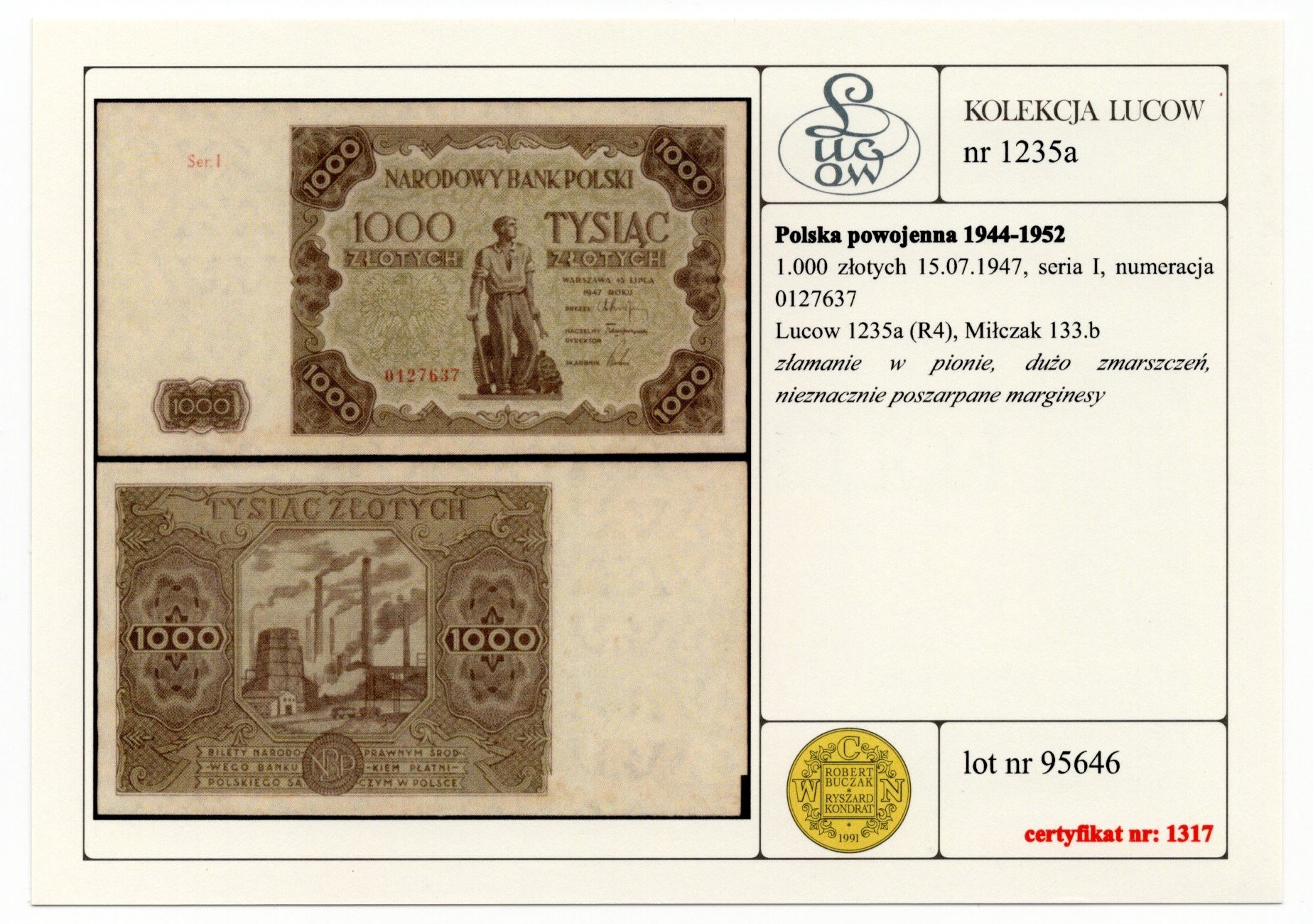 Banknot załamany w pionie, dużo delikatnych zmarszczeń, lekko poszarpane marginesy.