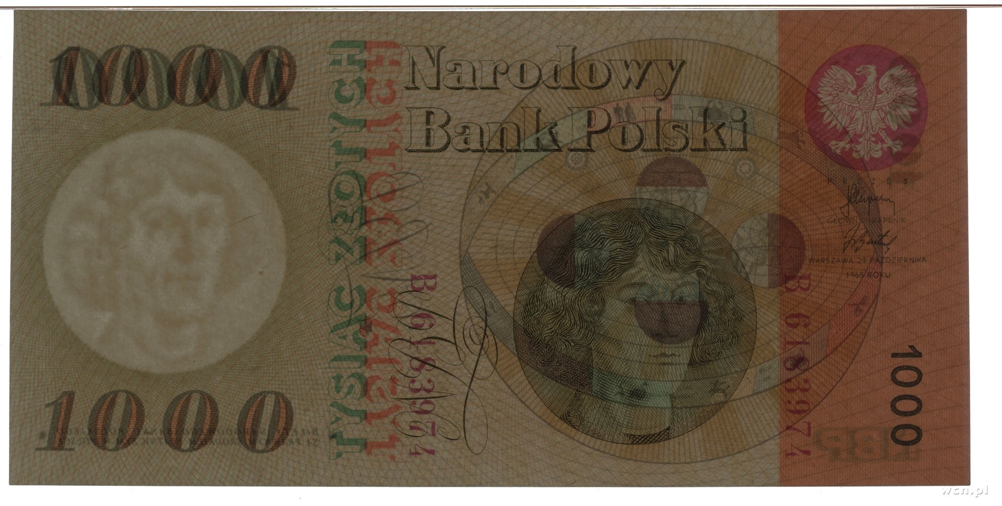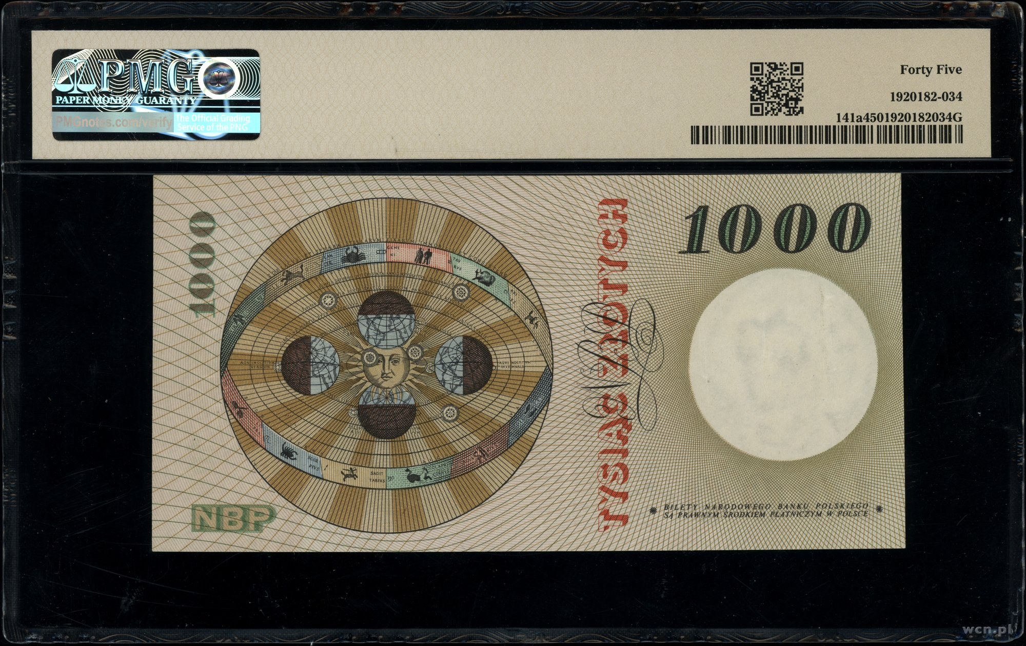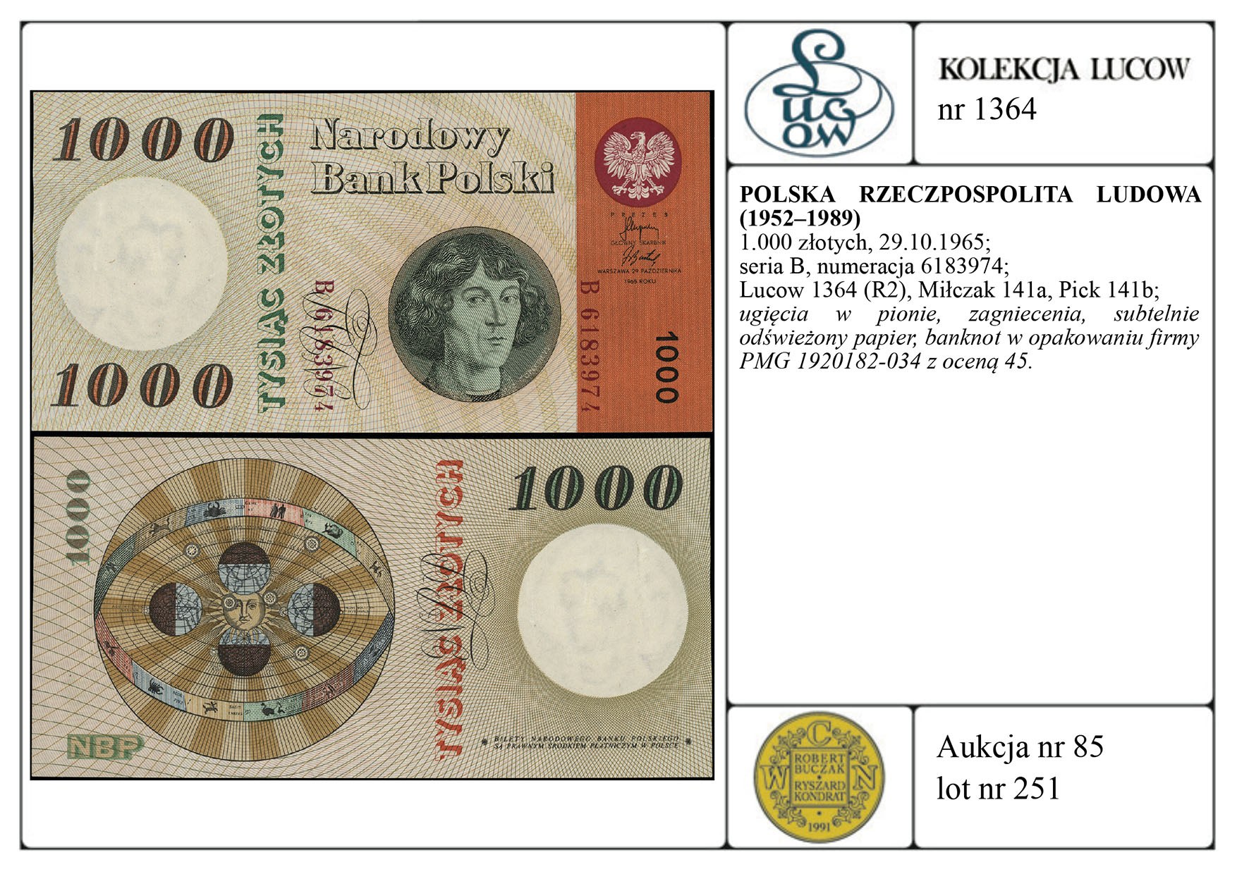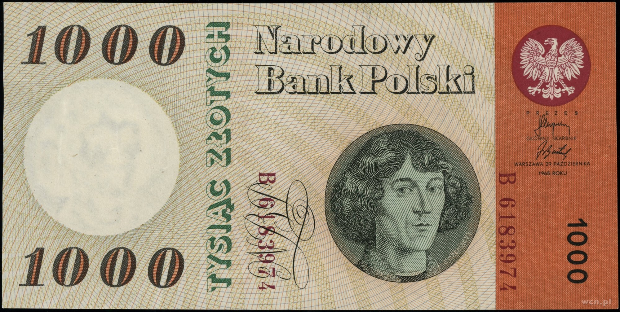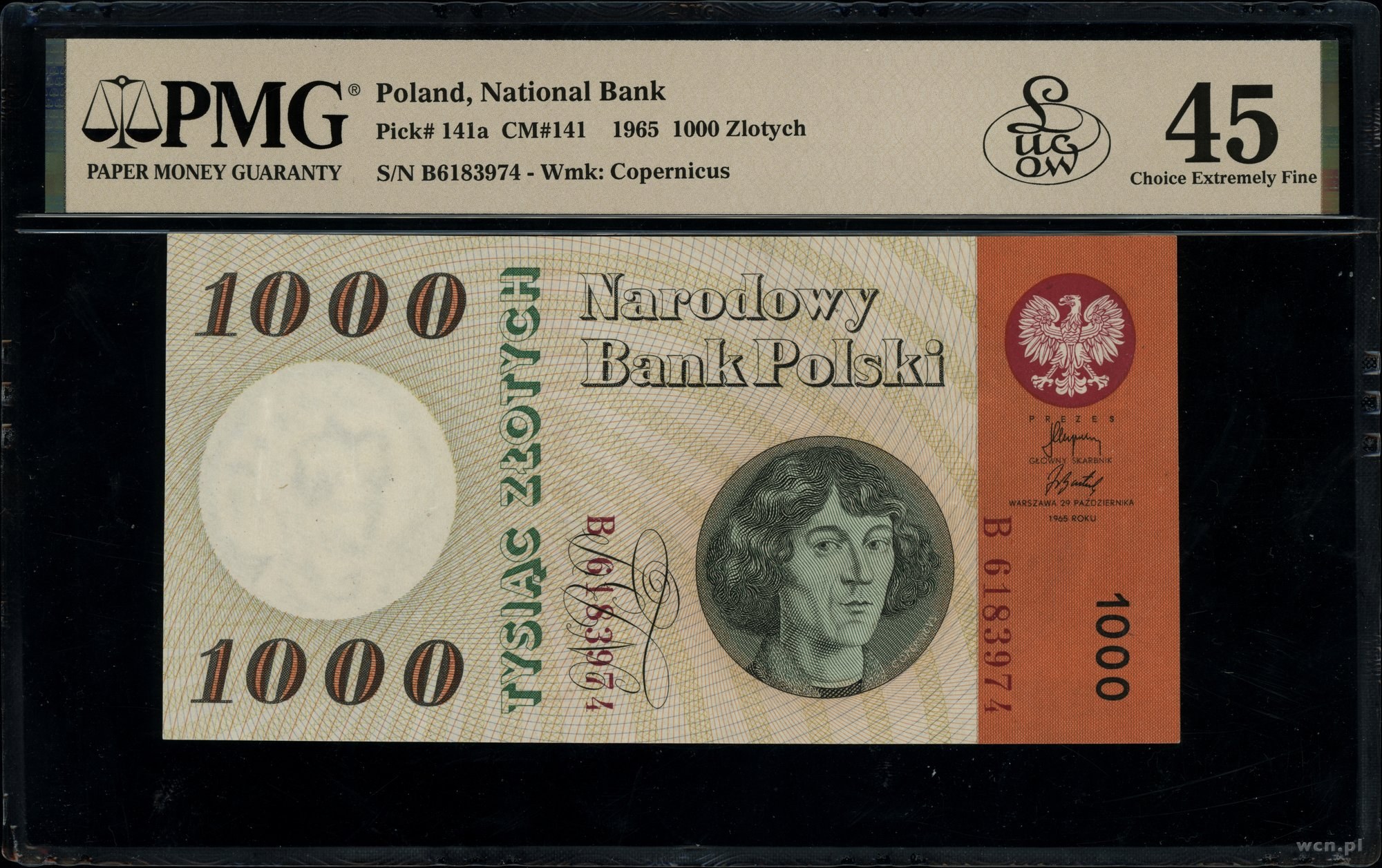 POLSKA RZECZPOSPOLITA LUDOWA (1952–1989) oraz III RZECZPOSPOLITA POLSKA (od 1989), 1.000 złotych, 29.10.1965; seria B, numeracja 6183974; Lucow 1364 (R2), Miłczak 141a, Pick 141b; ugięcia w pionie, zagniecenia, subtelnie odświeżony papier, banknot w opakowaniu firmy PMG 1920182-034 z oceną 45.