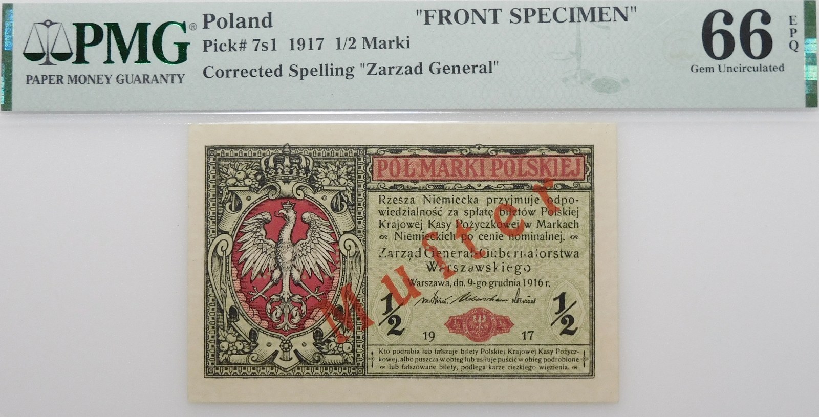 Wzór odmiany z późniejszą klauzulą, z prawidłowo użytym słowem „Generał”. Druk jednostronny awersu (rewers niezadrukowany) na oryginalnym papierze, z właściwym dla tego nominału znakiem wodnym, z ukośnym nadrukiem "Muster" w kolorze czerwonym i poziomą perforacją "DRUCKPROBE". Wzory emisji marek polskich GG 1916 należą do jednych z rzadszych wzorów w banknotach polskich, tu pozyskania każdego egzemplarza jest trudne, zwłaszcza w tak idealnym stanie zachowania.