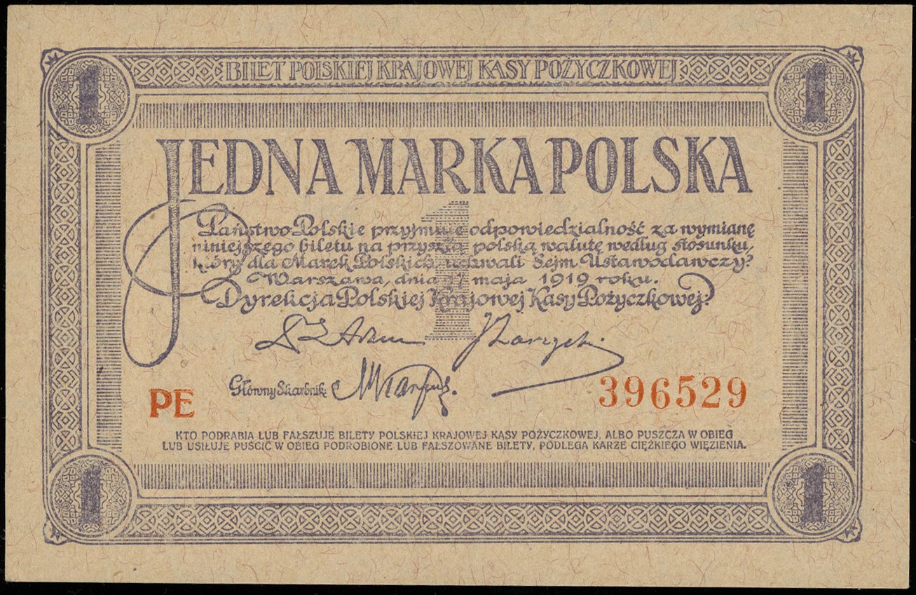 II Rzeczpospolita Polska 1918-1939, 1 marka polska 17.05.1919, seria PE, Miłczak 19a, Lucow 324 (R1), pięknie zachowane