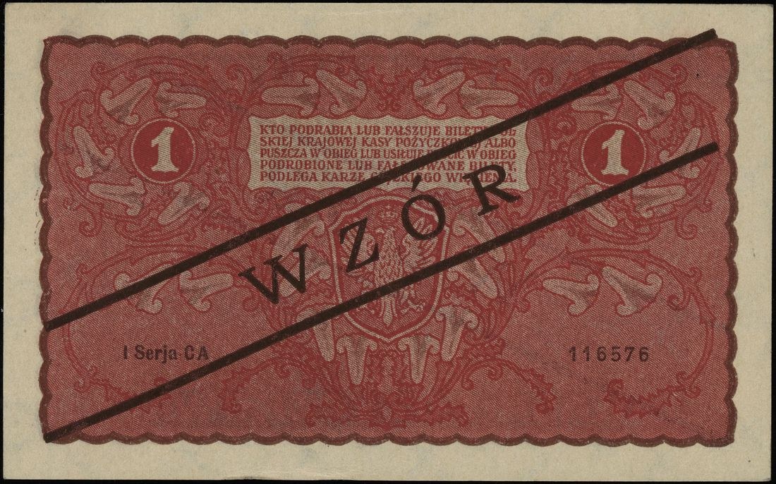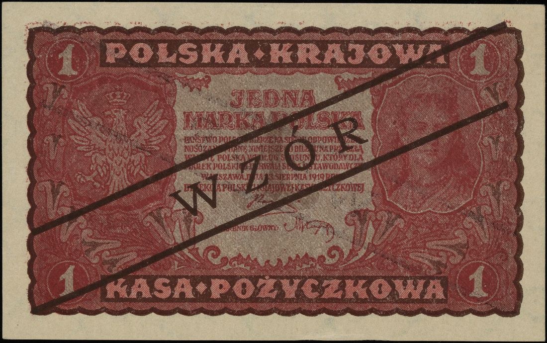 II Rzeczpospolita Polska 1918-1939, 1 marka polska 23.08.1919, seria I-CA, numeracja 116576, obustronnie ukośny czarny nadruk WZÓR, Lucow 356 (R4) - ilustrowana w katalogu kolekcji, Miłczak’05 - patrz 23, Miłczak’12 23Wa, pięknie zachowana i rzadka