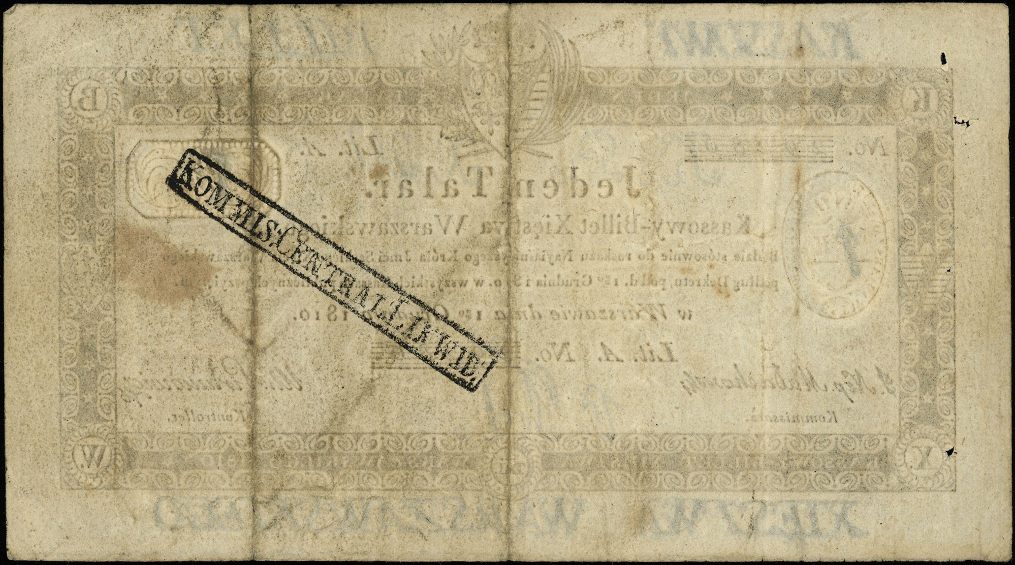 Księstwo Warszawskie 1807-1815, 1 talar 1.12.1810, podpis J. Nep. Małachowski, stempel na stronie odwrotnej, Miłczak A12bd, Lucow 54 (R2), niewielkie dziurki