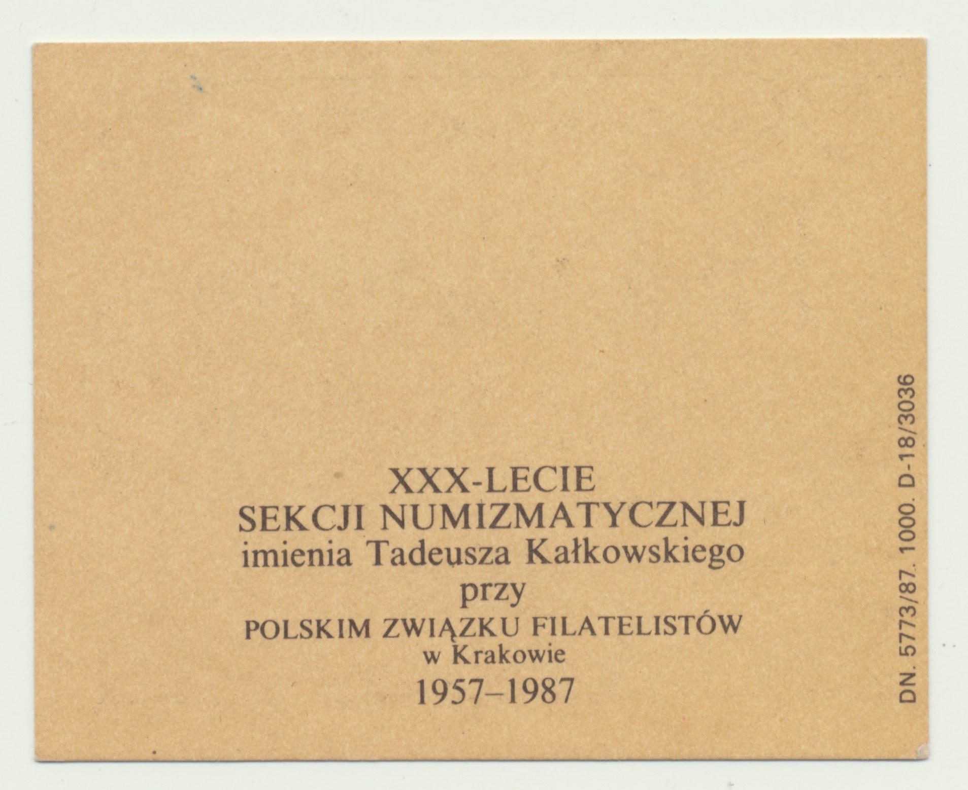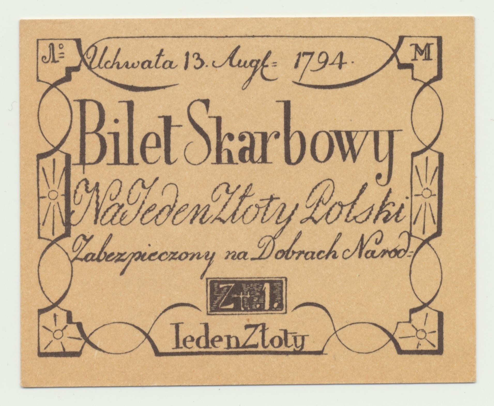 Bankowy egzemplarz, limitowany nakład 1000 szt. na XXX-lecie Sekcji Numizmatycznej im.T. Kałkowskiego 1987. Można stwierdzić, że większość kolekcjonerów nigdy nie będzie posiadała w swojej kolekcji oryginalnego banknotu 1 zł 1794.