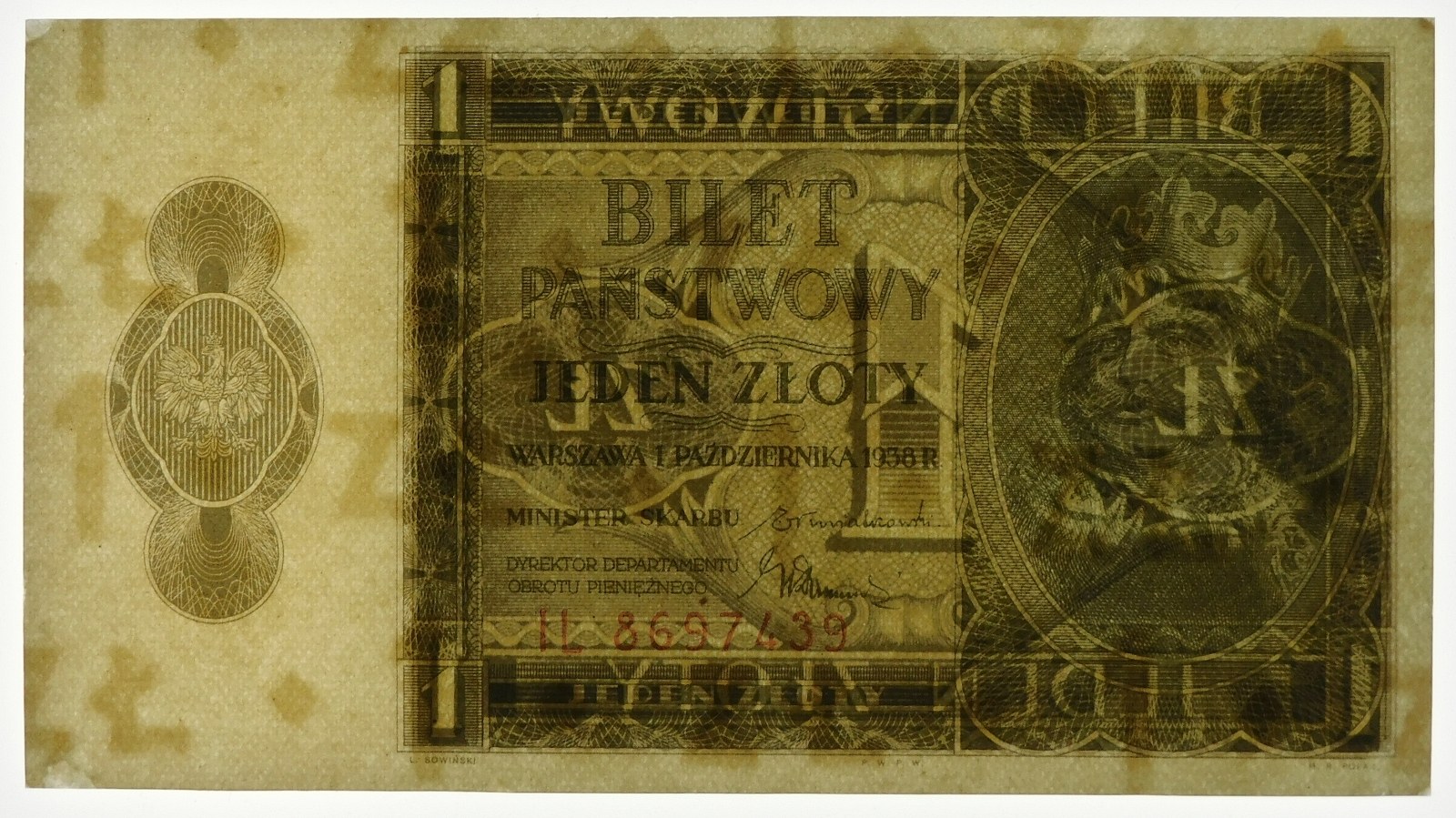 Ładny egzemplarz, o bardzo dobrej prezencji, posiada delikatne przebarwienia na marginesach, oraz prześwitki papieru na końcówkach wszystkich narożników, najprawdopodobniej w tych miejscach banknot był wklejany do albumu(?)