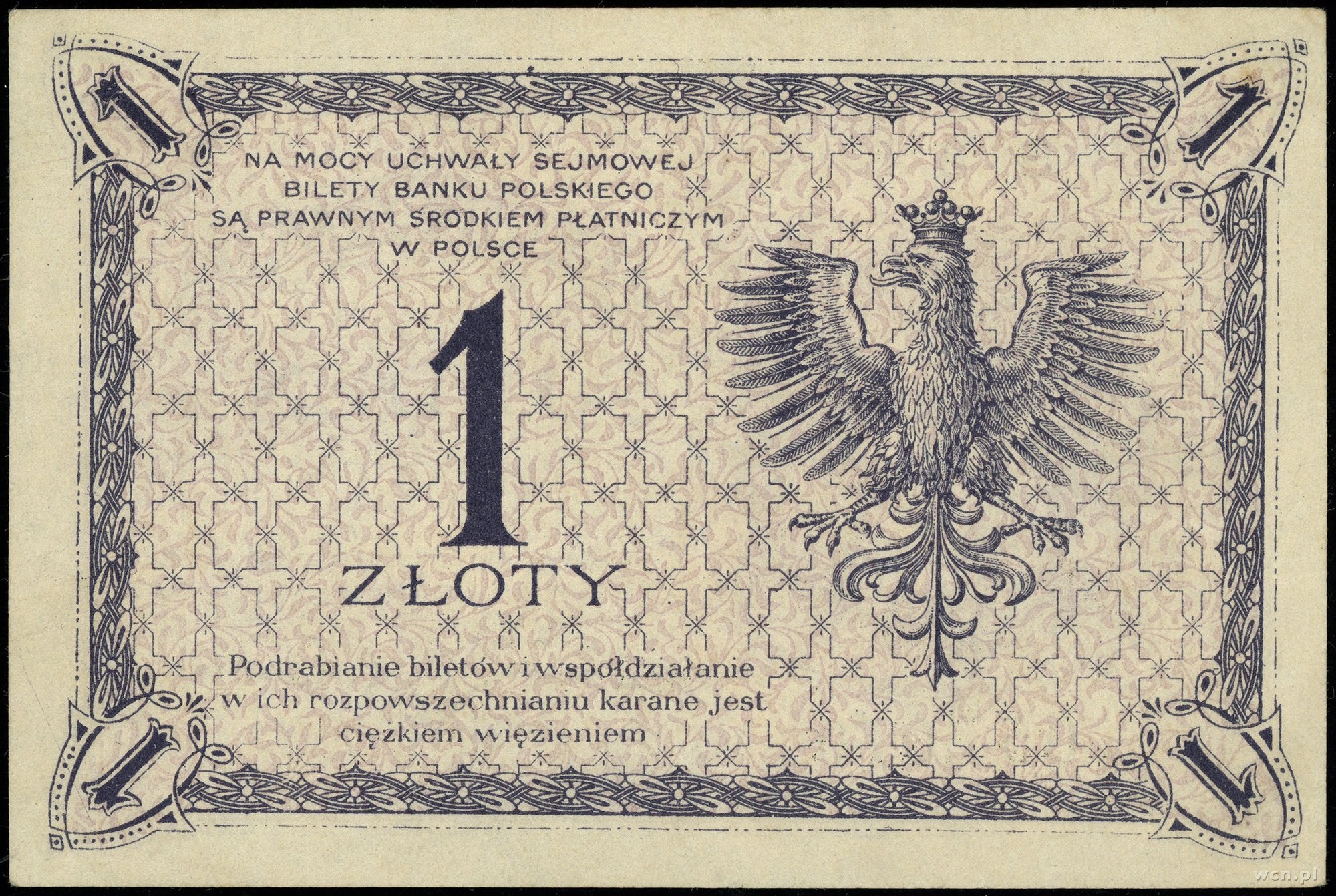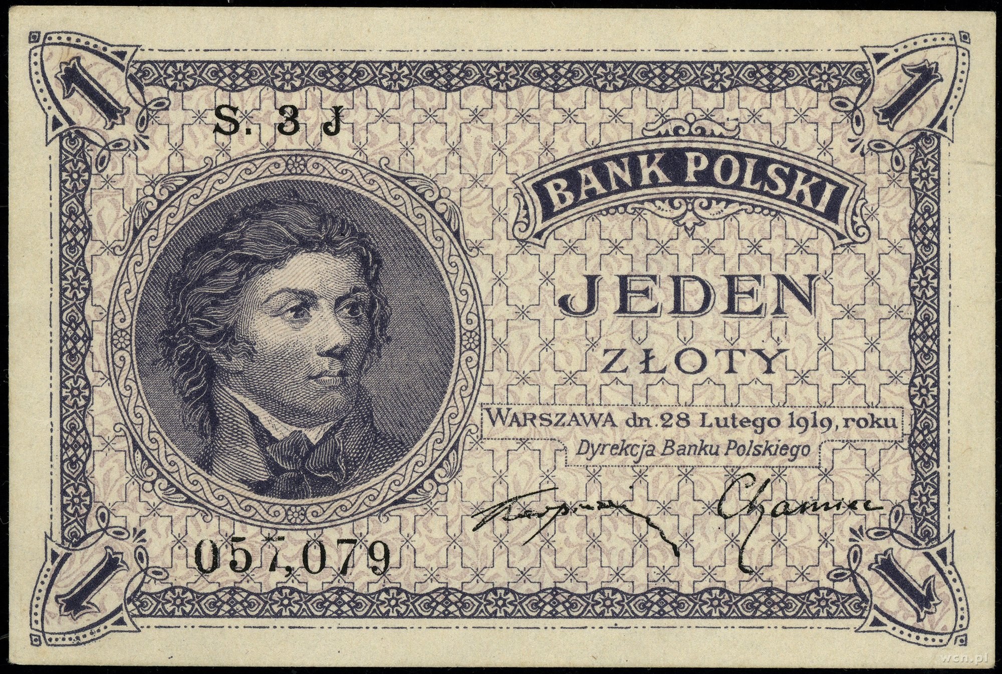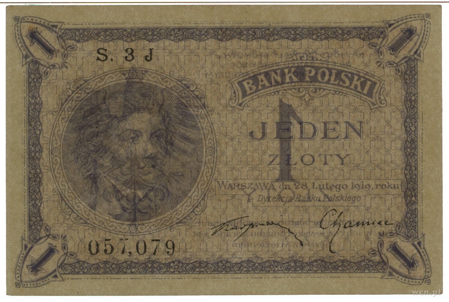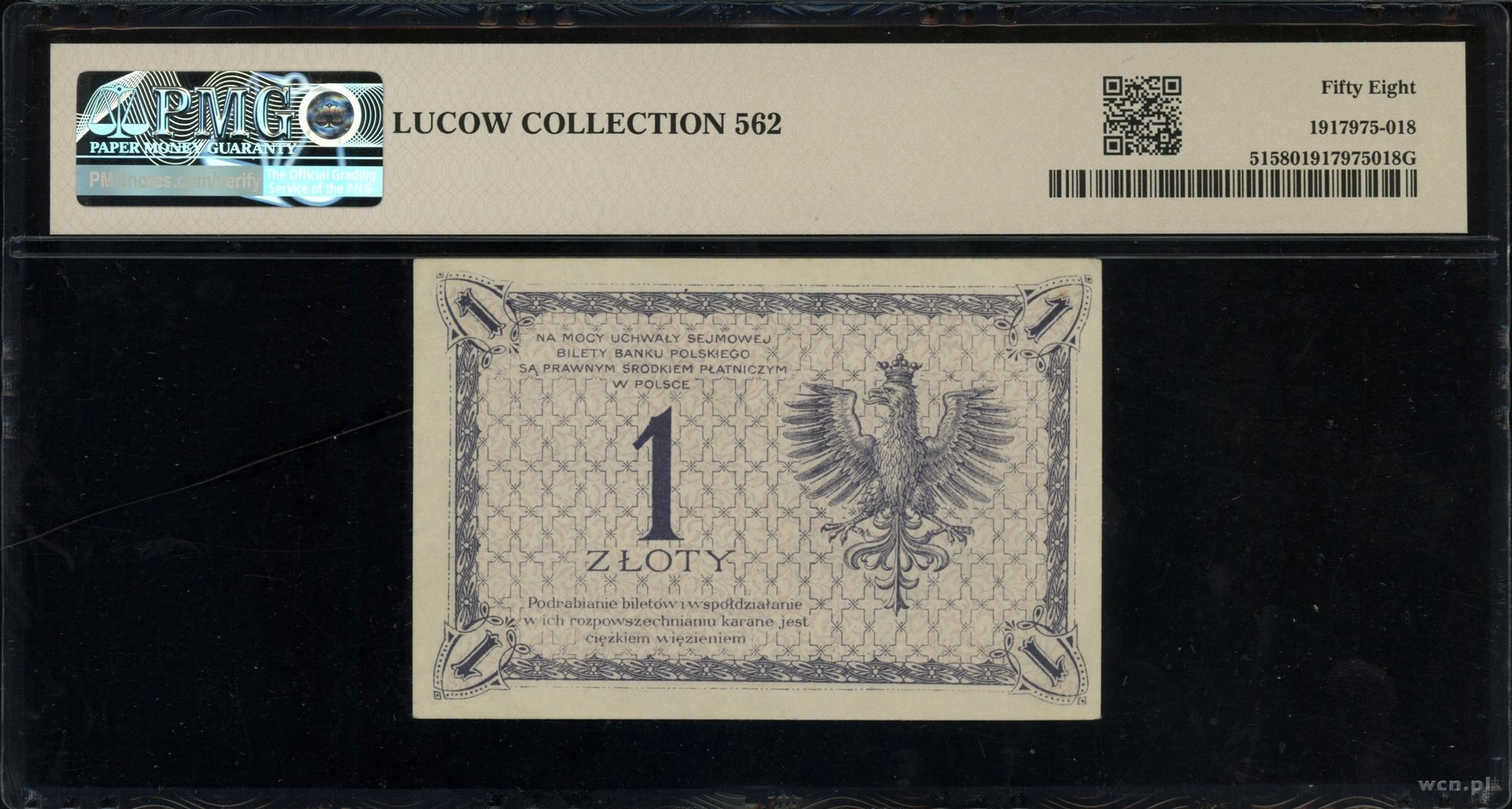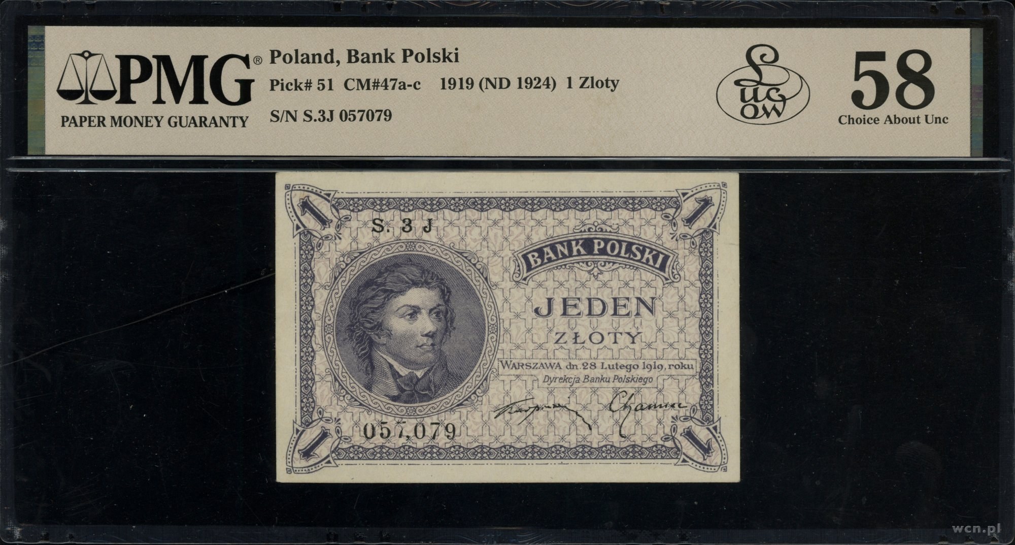 Emisje po reformie Władysława Grabskiego, 1 złoty, 28.02.1919; seria 3 J, numeracja 057,079; Lucow 562 (R4), Miłczak 47a, Pick 51; miejscowe ugięcia i zagniecenia, banknot pięknej prezencji w opakowaniu PMG 1917975-018 z oceną 58.