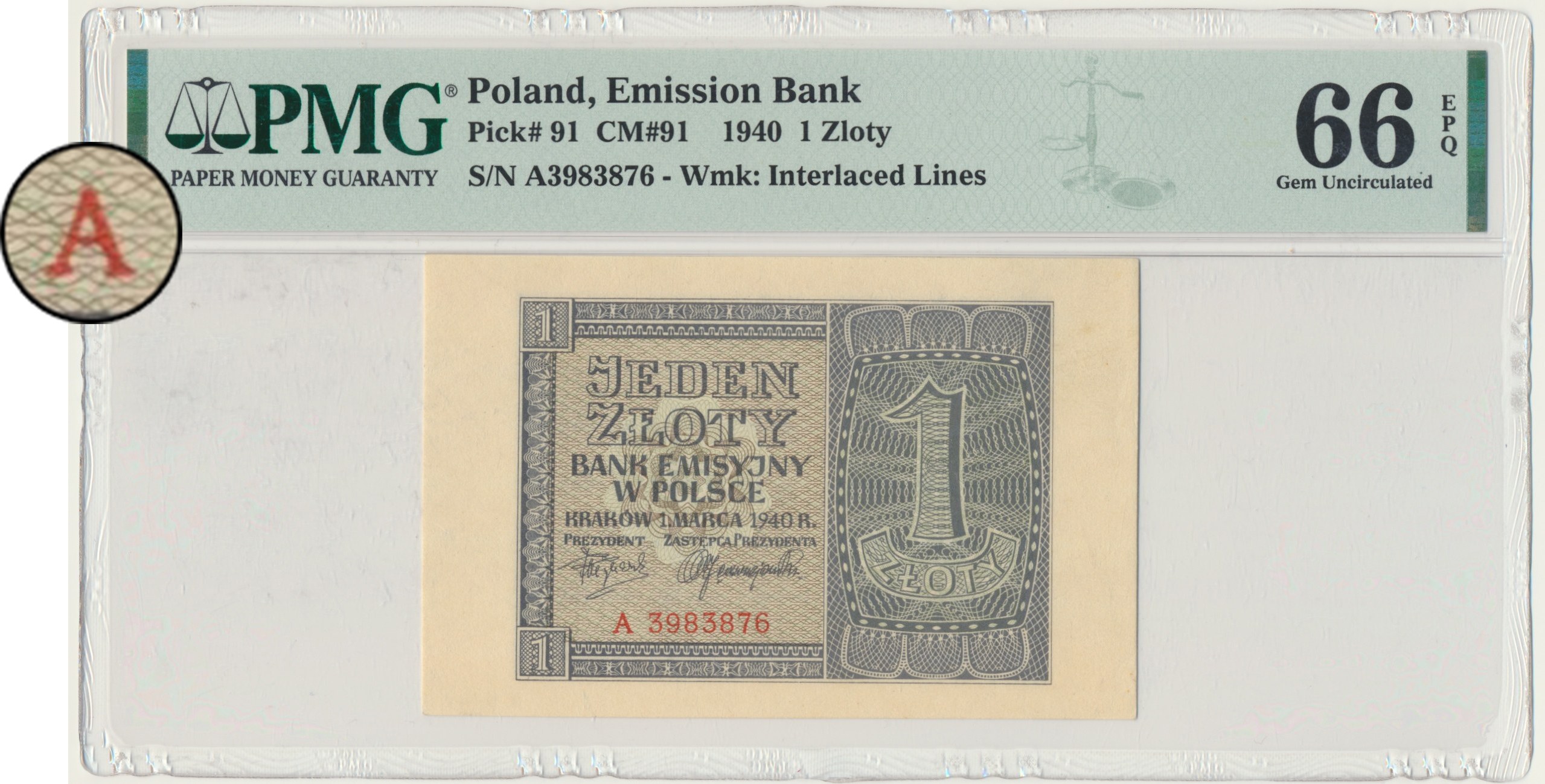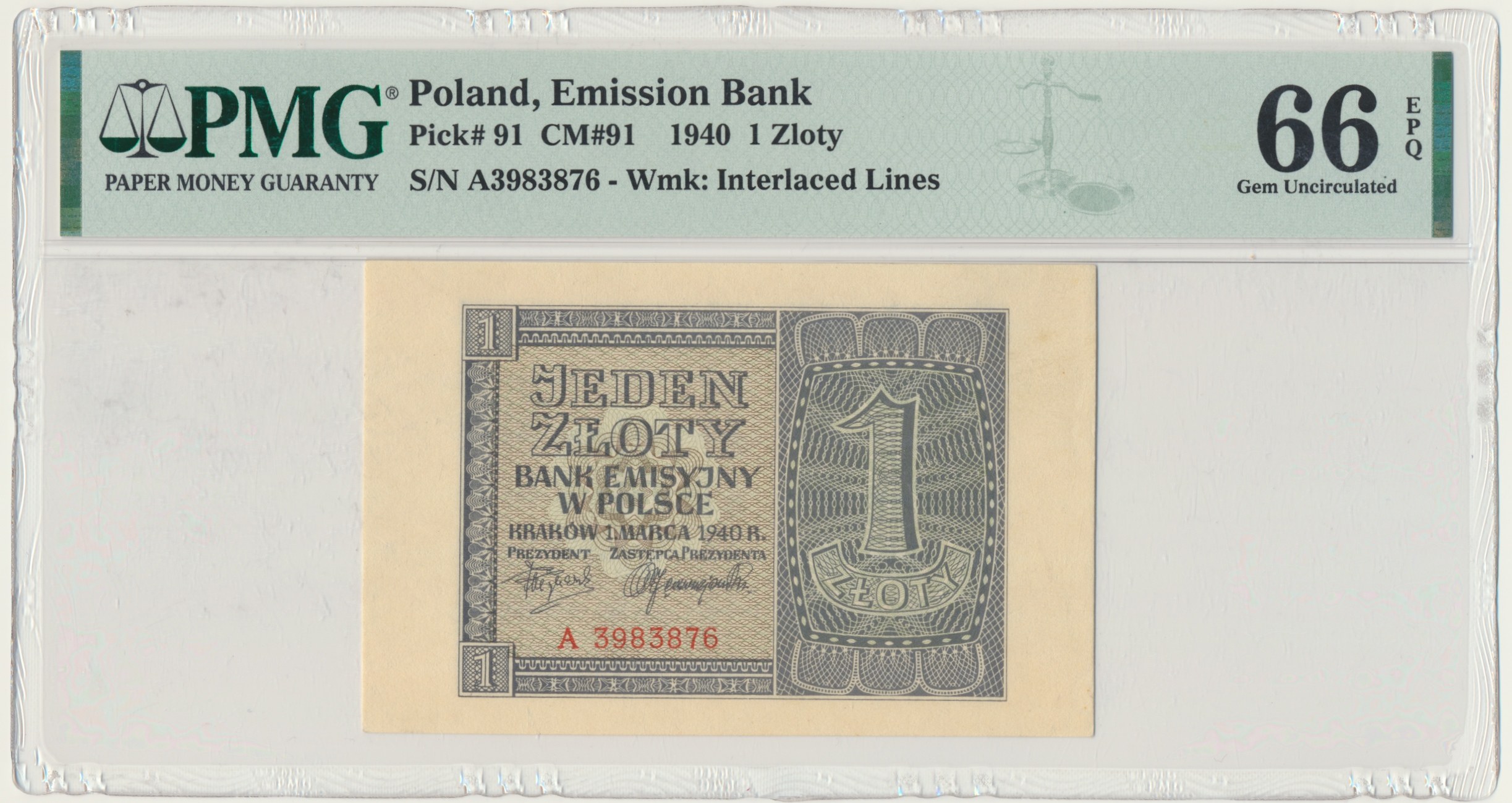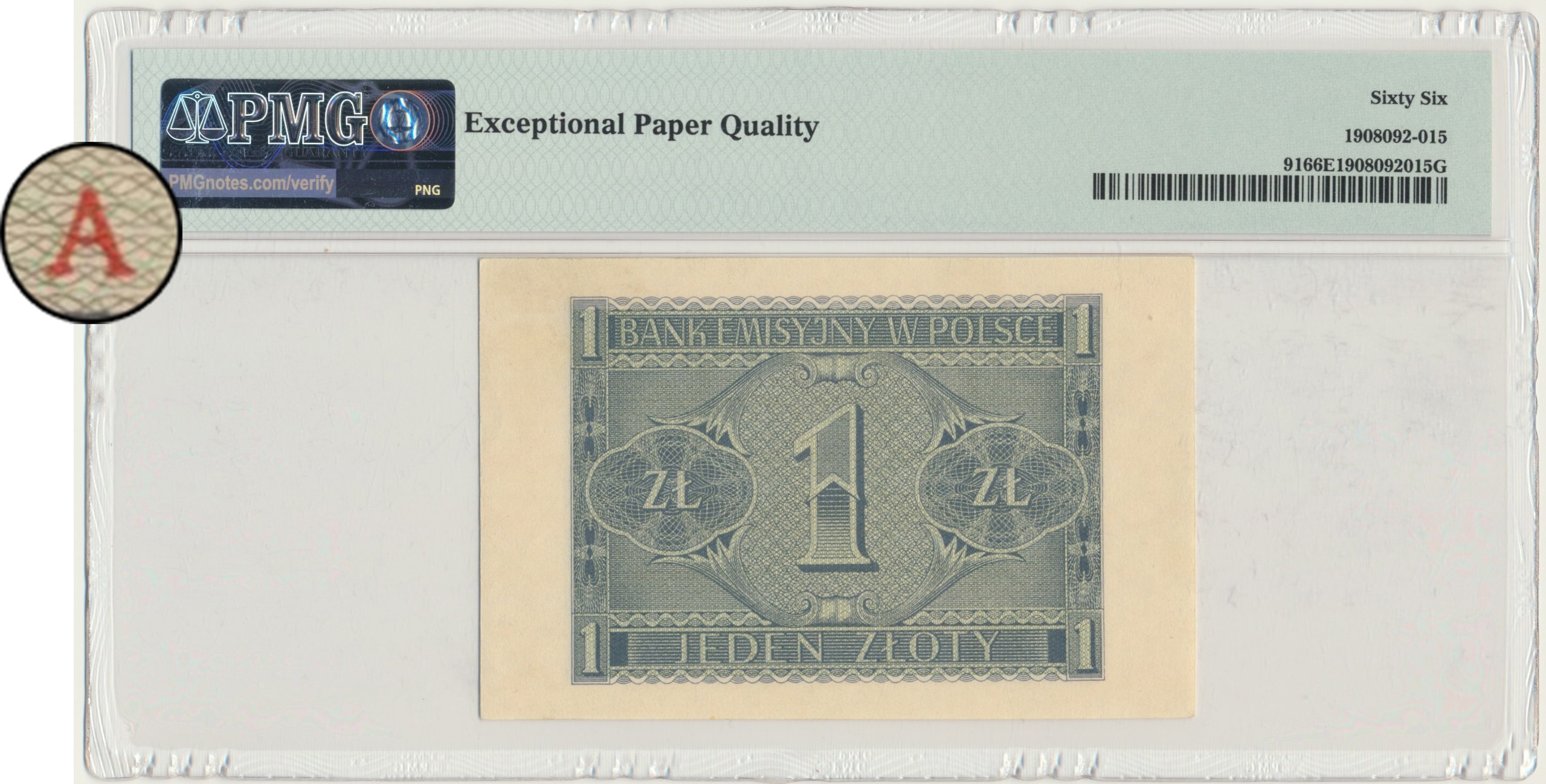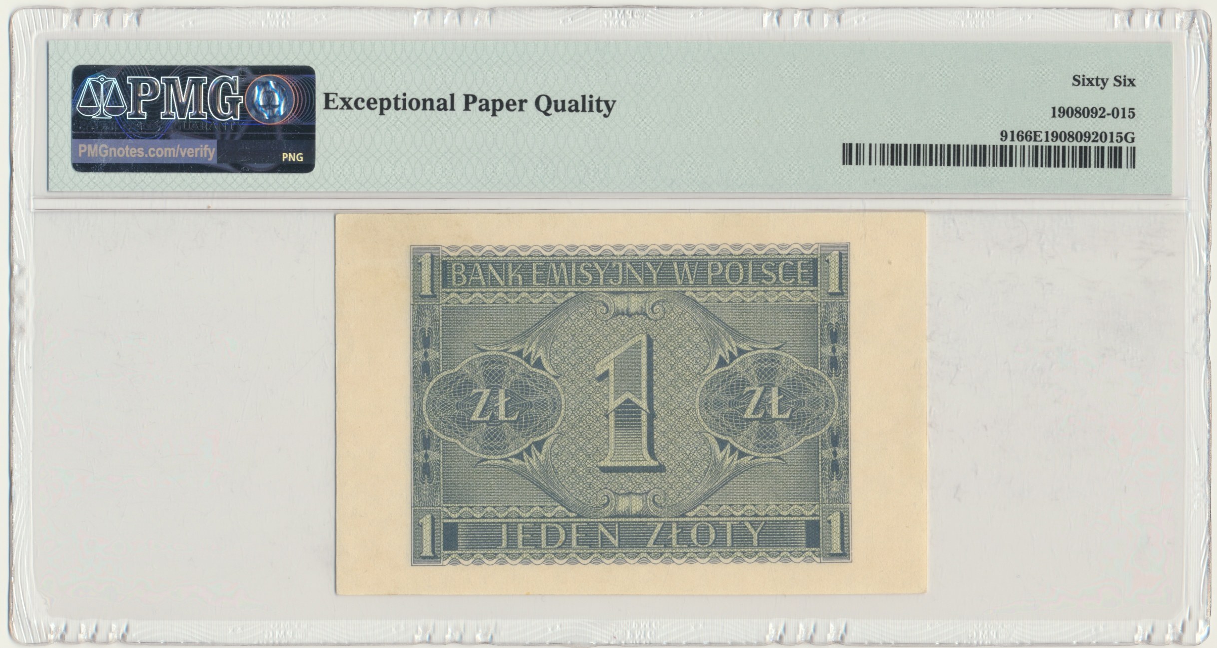 Banknot opatrzony certyfikatem PMG z bardzo dobrą oceną PMG 66 EPQ.