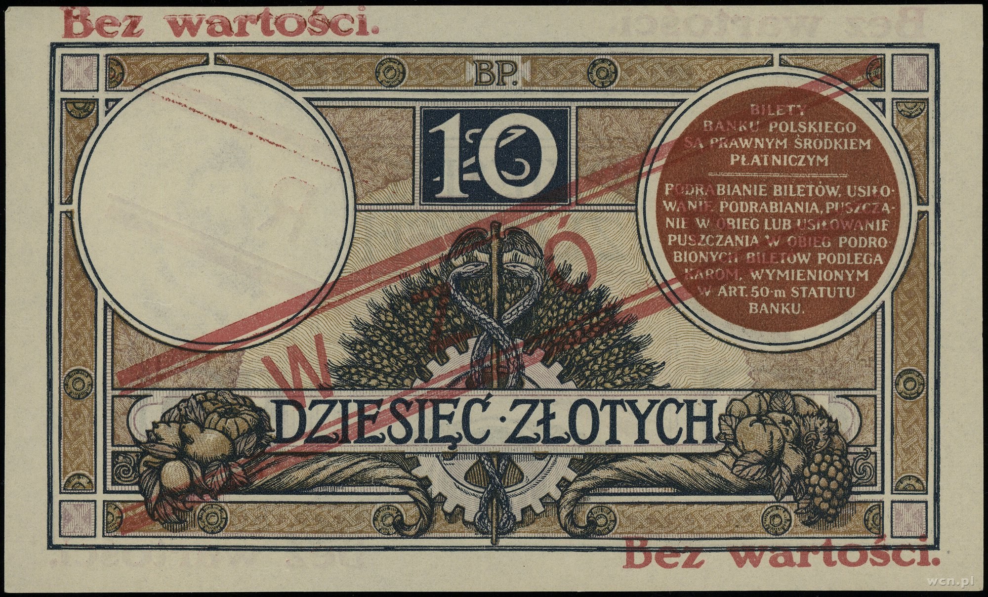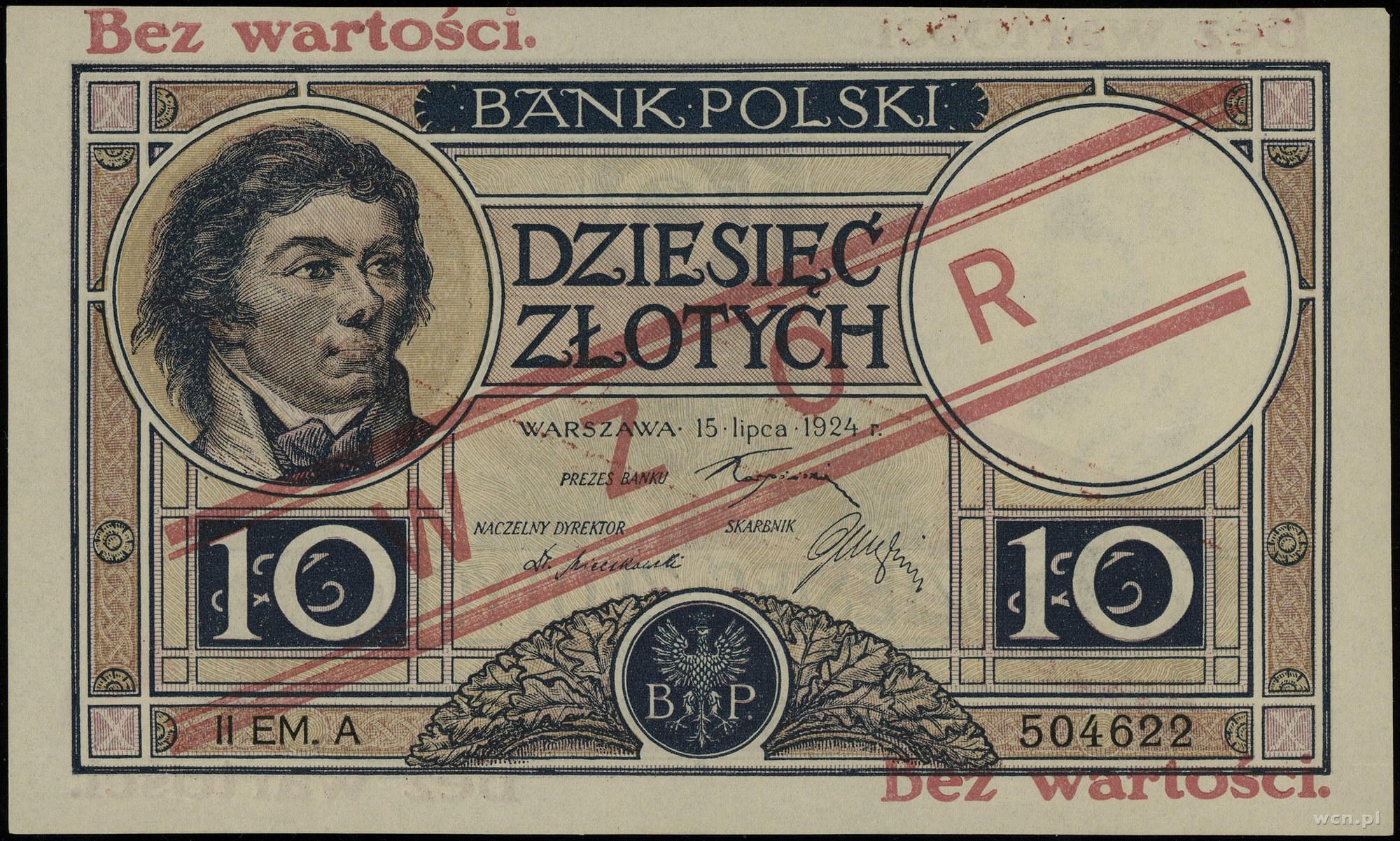 Emisje po reformie Władysława Grabskiego, 10 złotych, 15.07.1924; II emisja, seria A, numeracja 504622, czerwony ukośny nadruk „WZÓR”, dwukrotnie poziomo „Bez wartości”, bez perforacji; Lucow 605a (R6), Miłczak 58Wa; drobne zagniecenia, pięknie zachowane i bardzo rzadkie - szczególnie bez perforacji.