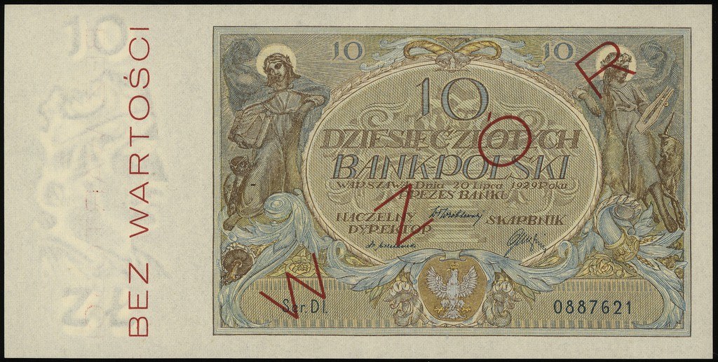 II Rzeczpospolita Polska 1918-1939, 10 złotych 20.07.1929, seria DI., numeracja 0887621, po obu stronach ukośny czerwony nadruk \WZÓR\" oraz pionowy \"BEZ WARTOŚCI, papier ze znakiem wodnym \"10 / ZŁ, Lucow 646 (R4) - ilustrowane w katalogu kolekcji
