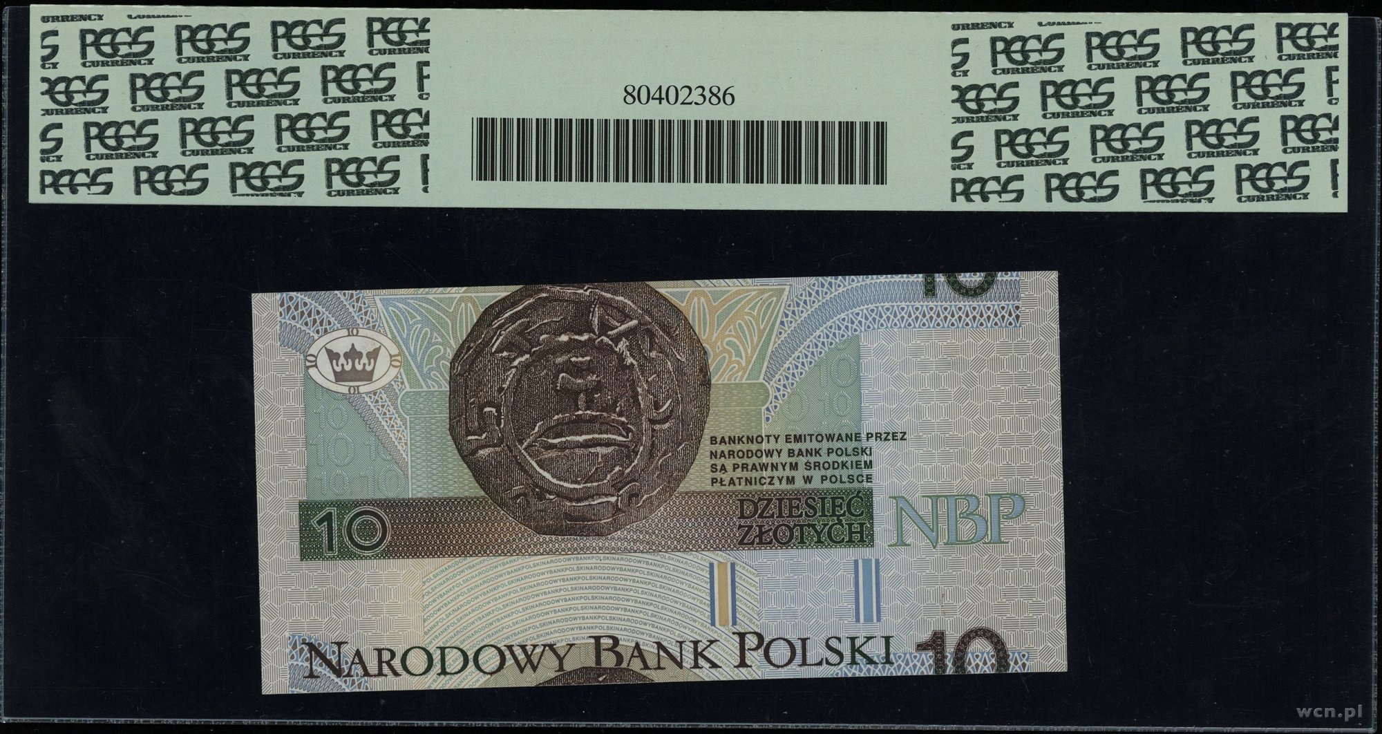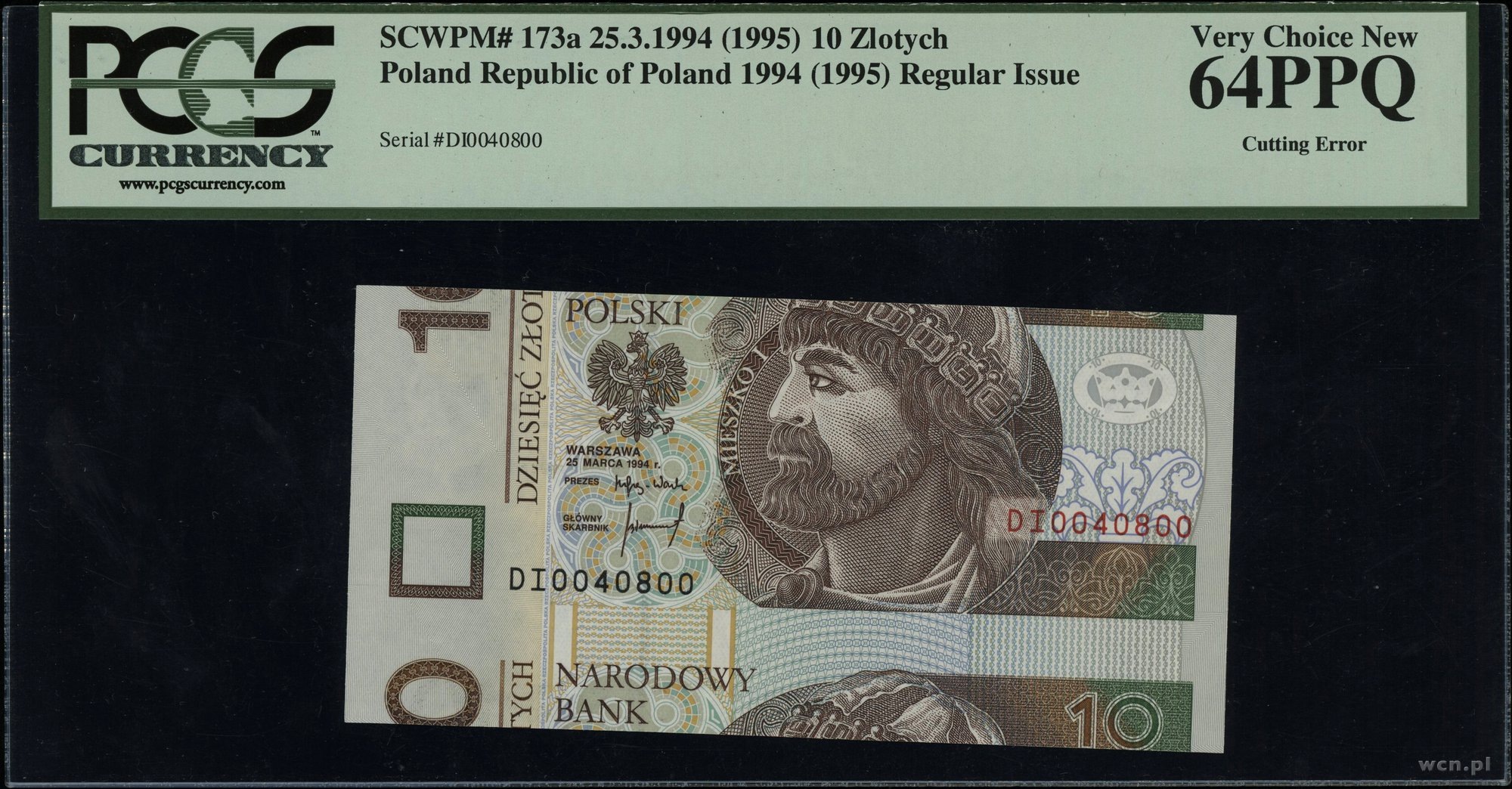 III Rzeczpospolita Polska od 1989, 10 złotych 25.03.1994, seria DI, numeracja 0040800, błąd wycięcia banknotu - przesunięcie o ponad centrymetr w pionie; Lucow 1565 - ale nie notuje takiego błędu, Miłczak jak 196b; wyśmienicie zachowane, w opakowaniu firmy PCGS z oceną Very Chice New 64PPQ