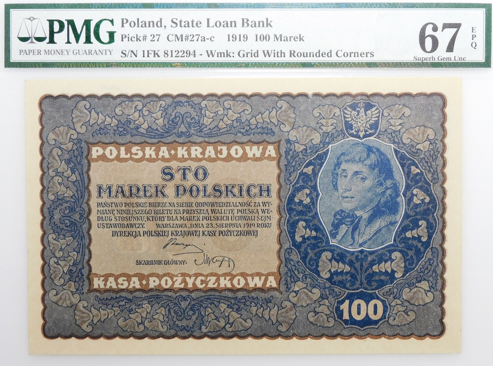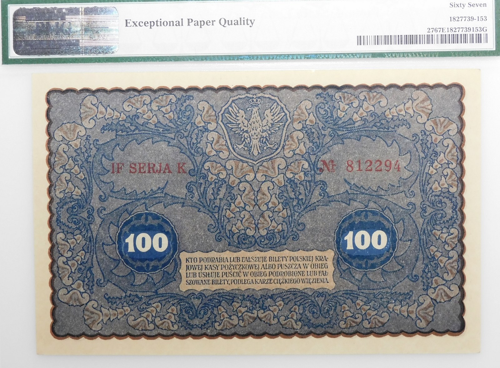 Atrakcyjny egzemplarz, potwierdzony wysoką notą gradingową PMG z adnotacją EPQ świadczącą o wyjątkowej jakości papieru - jest to 2-ga MAX NOTA tego nominału w rejestrze PMG, tylko jeden egzemplarz został oceniony wyżej.