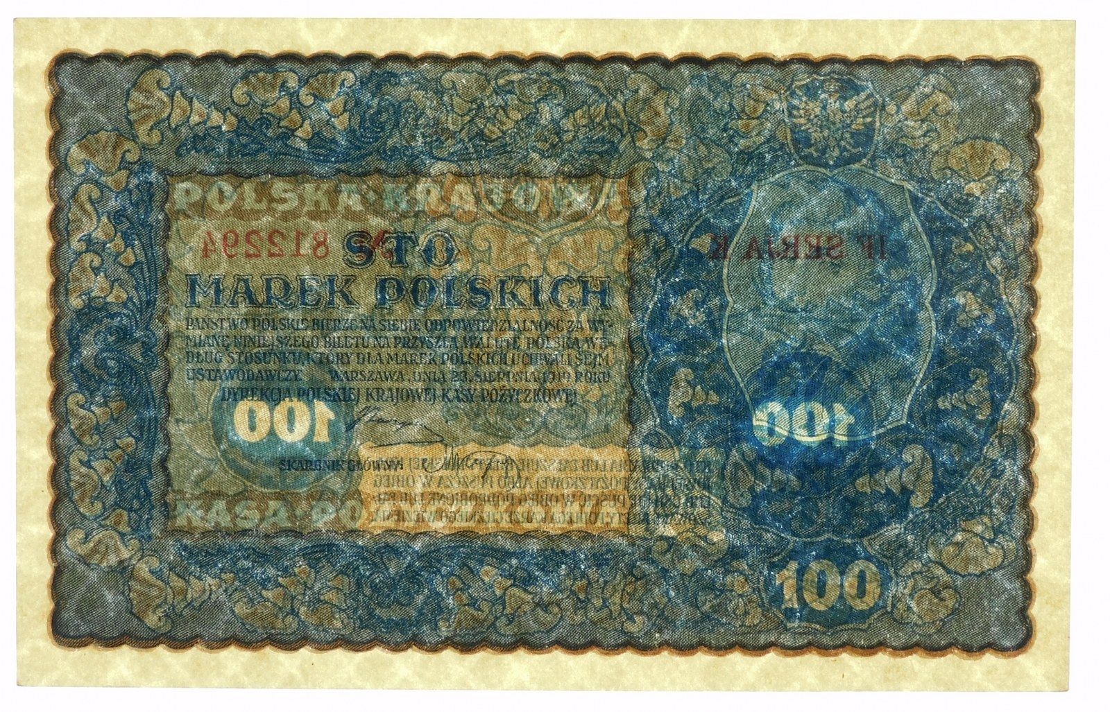 Banknot 100 marek polskich 1919, serii : IF SERJA K , tzw. emisji wiedeńskiej.