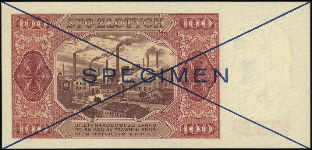 Polska powojenna 1944-1952, 100 złotych 1.07.1948 seria D 123456, D 789000, po obu stronach skreślony i poziomy nadruk \SPECIMEN\" w kolorze niebieskim