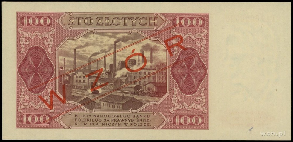 Polska powojenna 1944-1952, 100 złotych 1.07.1948, seria FG, numeracja 0000002, obustronnie czerwony ukośny nadruk WZÓR; Lucow 1292 (R4), Miłczak 139Wf (odmiana); przegięte w pionie, ale pięknie zachowane, wzór Jaroszewicza