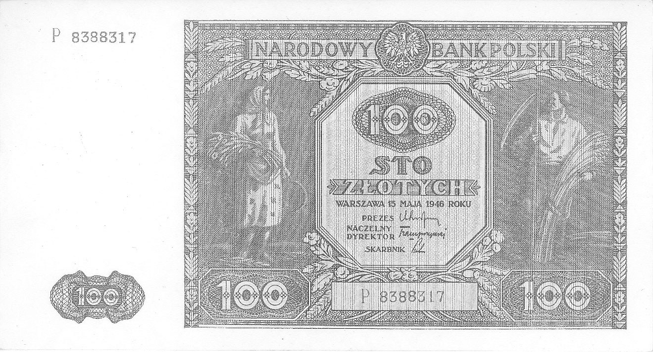 Banknoty powojenne, 100 złotych 15.05.1946, Seria P /litera wysokości 4 mm/, Pick 129