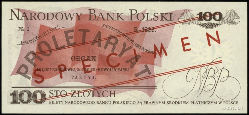 Polska Rzeczpospolita Ludowa 1952-1989, 100 złotych 17.05.1976; czerwony ukośny nadruk WZÓR / SPECIMEN, seria EP, numeracja 0000979; Lucow - nie notuje, Miłczak 146 (nie wyodrębnia takiego wzoru); wyśmienicie zachowane, wzór Jaroszewicza*