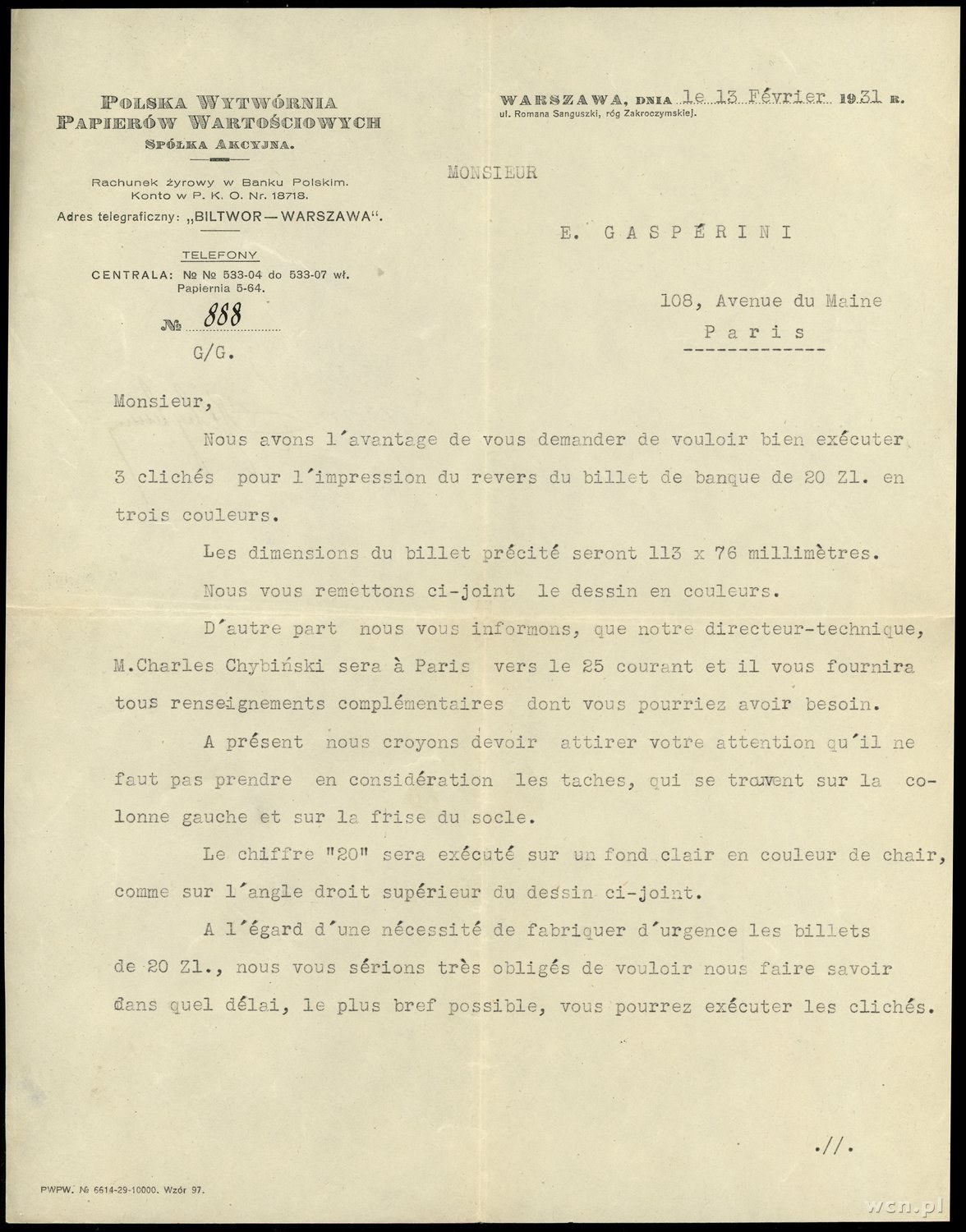 emisje po reformie Władysława Grabskiego, 100 złotych, 1932; 30 odbitek technologicznych z różnych faz projektowych banknotu 100 złotych z datą emisji 2.06.1932 wraz z dołączonym pismem Karola Chybińskiego do Gasperiniego z dnia 13 lutego 1931 roku, dotyczącym zamówienia u niego klisz potrzebnych do wykonania banknotu; Lucow - (patrz 670), Miłczak - (patrz 73); duża rzadkość.