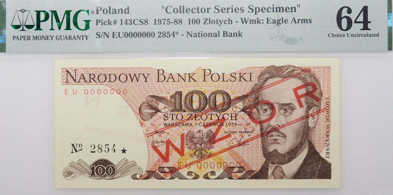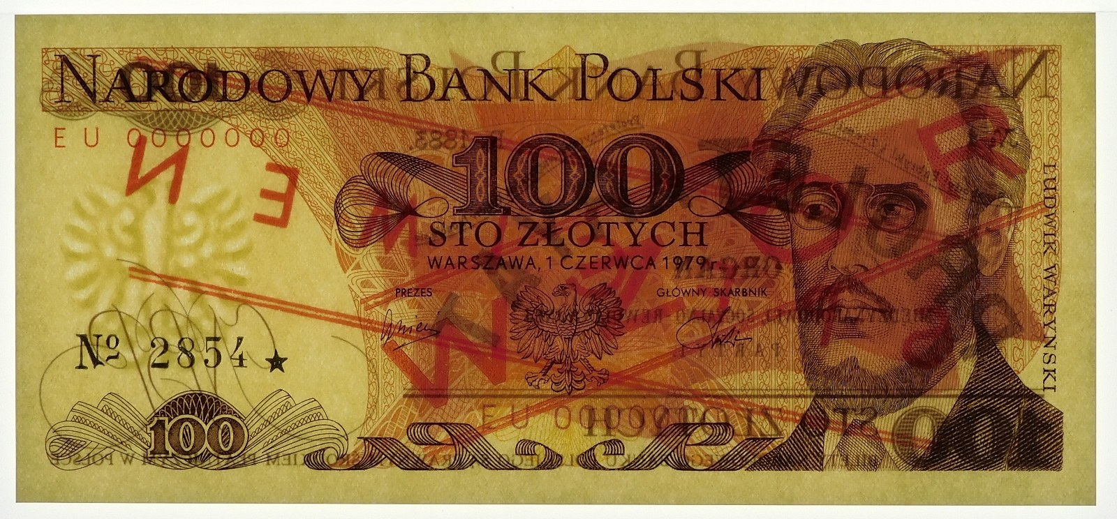 Banknot 100 złotych 1979 WZÓR - ser. EU , numeracja zerowa: 0000000 - nr nakładowy wzoru: 2854★