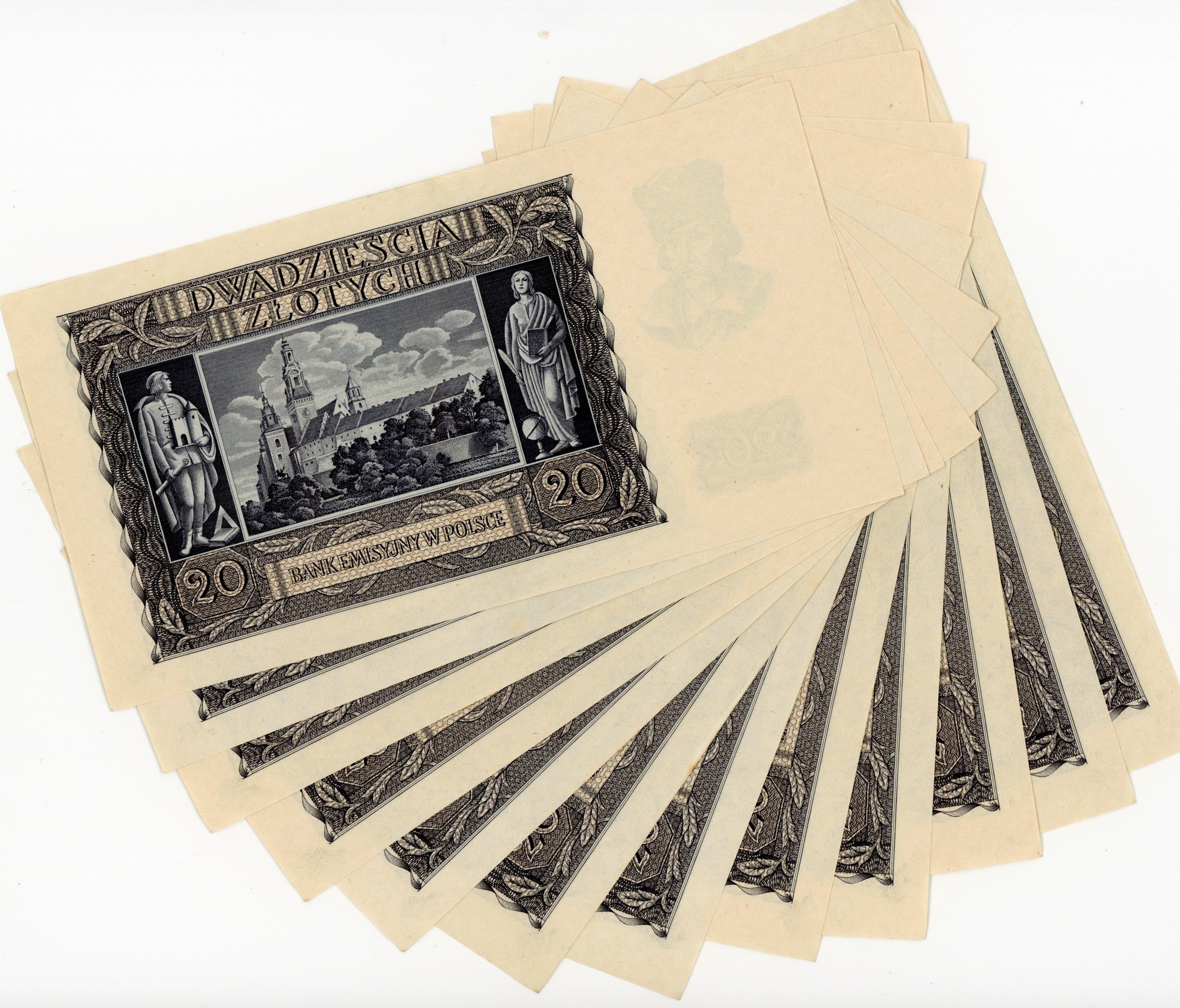 Banknot z jednej paczki bankowej z numerami seryjnymi po kolei D 5336056-5336067