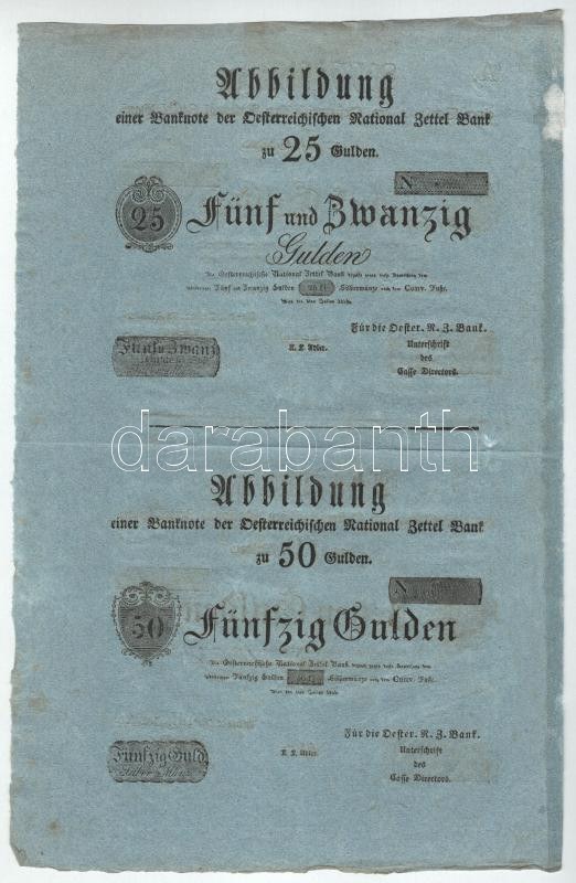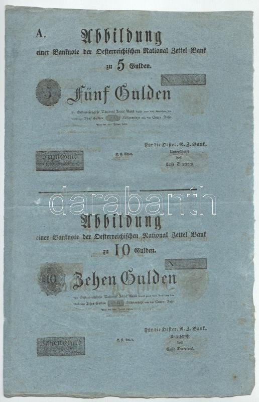 1816. Formuláre garnítúra: 5G + 10G + 25G + 50G ívben, kék színű merített papíron. A bankjegyek az ív két oldala alapján párokban 5G - 25G és 10G - 50G. T:XF / Hungary 1816. Set of Formulares: 5 Gulden + 10 Gulden + 25 Gulden + 50 Gulden on blue paper. The banknotes in pairs on each side of the sheet C:XF Adamo G55M-G58M