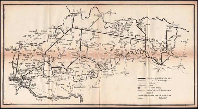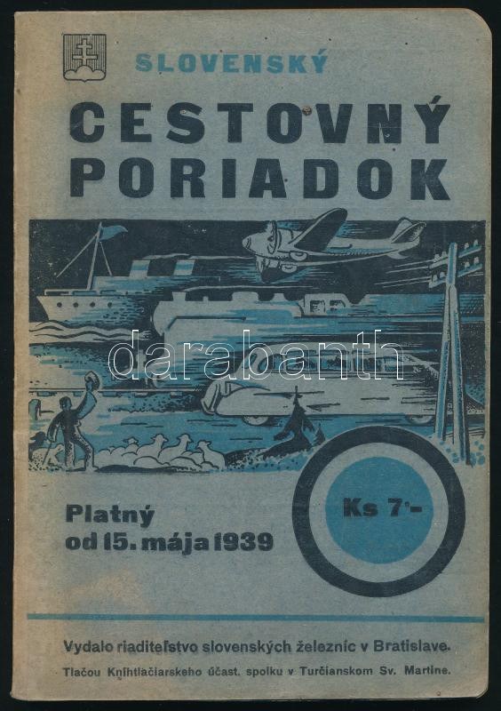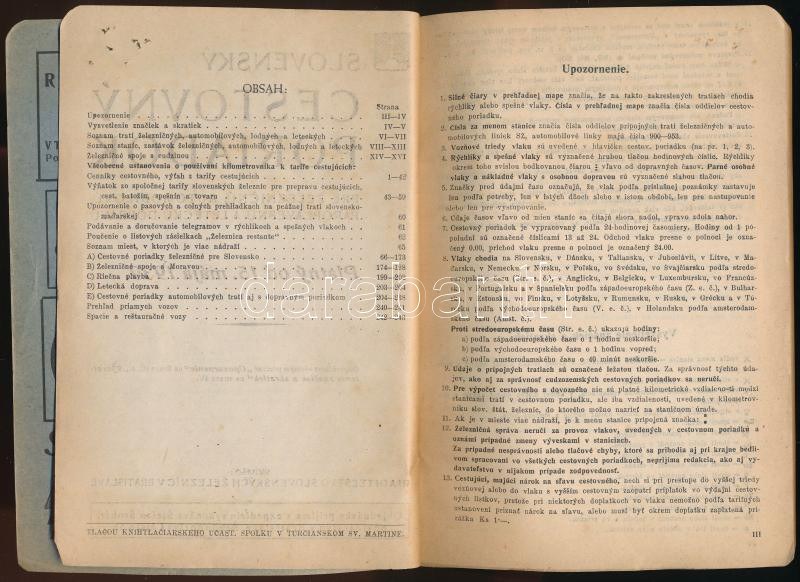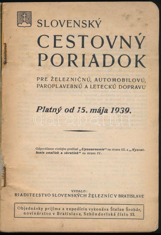 1939 Szlovák menetrend vasúti, autóipari, gőzhajózási és légi közlekedéshez, térképmelléklettel...