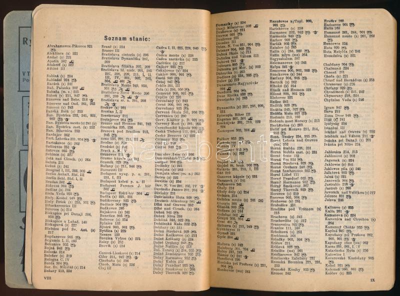 1939 Szlovák menetrend vasúti, autóipari, gőzhajózási és légi közlekedéshez, térképmelléklettel, 243p
