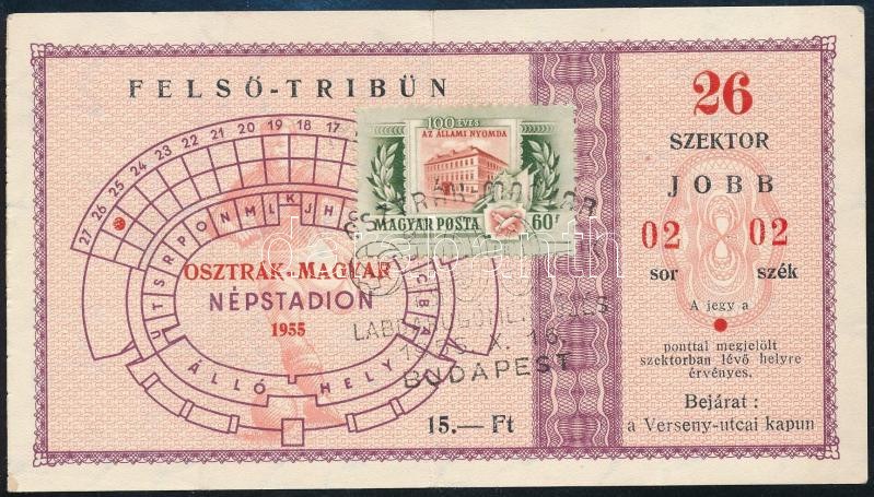 1955 Belépőjegy a Népstadionba az Ausztira-Magyar football-mérkőzésre Alkalmi bélyegzésekkel / Ticket for the football match Hungary vs Austria.
