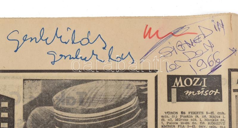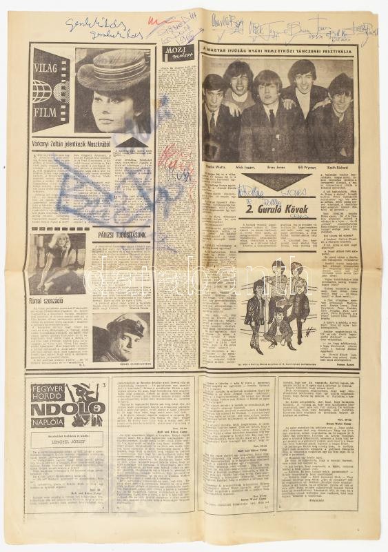 1966 The Rolling Stones a tagok, Mick Jagger, Keith Richards, Brian Jones, Billy Wyman és Charlie Watts által autográf dedikált Szép Szó c. újság a zenekarról szóló cikkel / Autograph signatures of the members of The Rolling Stones: Mick Jagger, Keith Richards, Brian Jones, Billy Wyman and Charlie Watts on a Hungarian newspaper article about the band