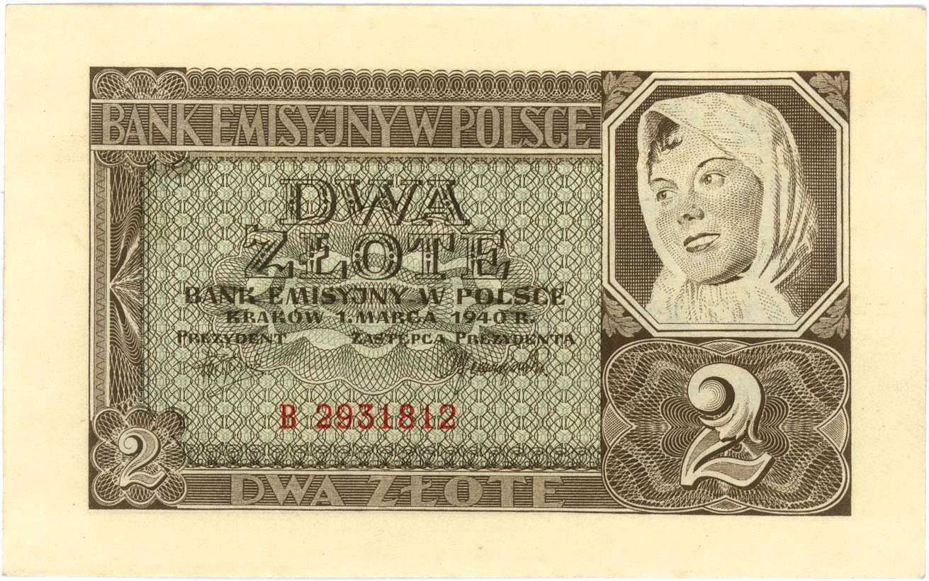 Generalna Gubernia 1939-1945, 2 złote 1.03.1940, seria B, Miłczak 92, Lucow 770 (R2), rzadkie i bardzo ładnie zachowane