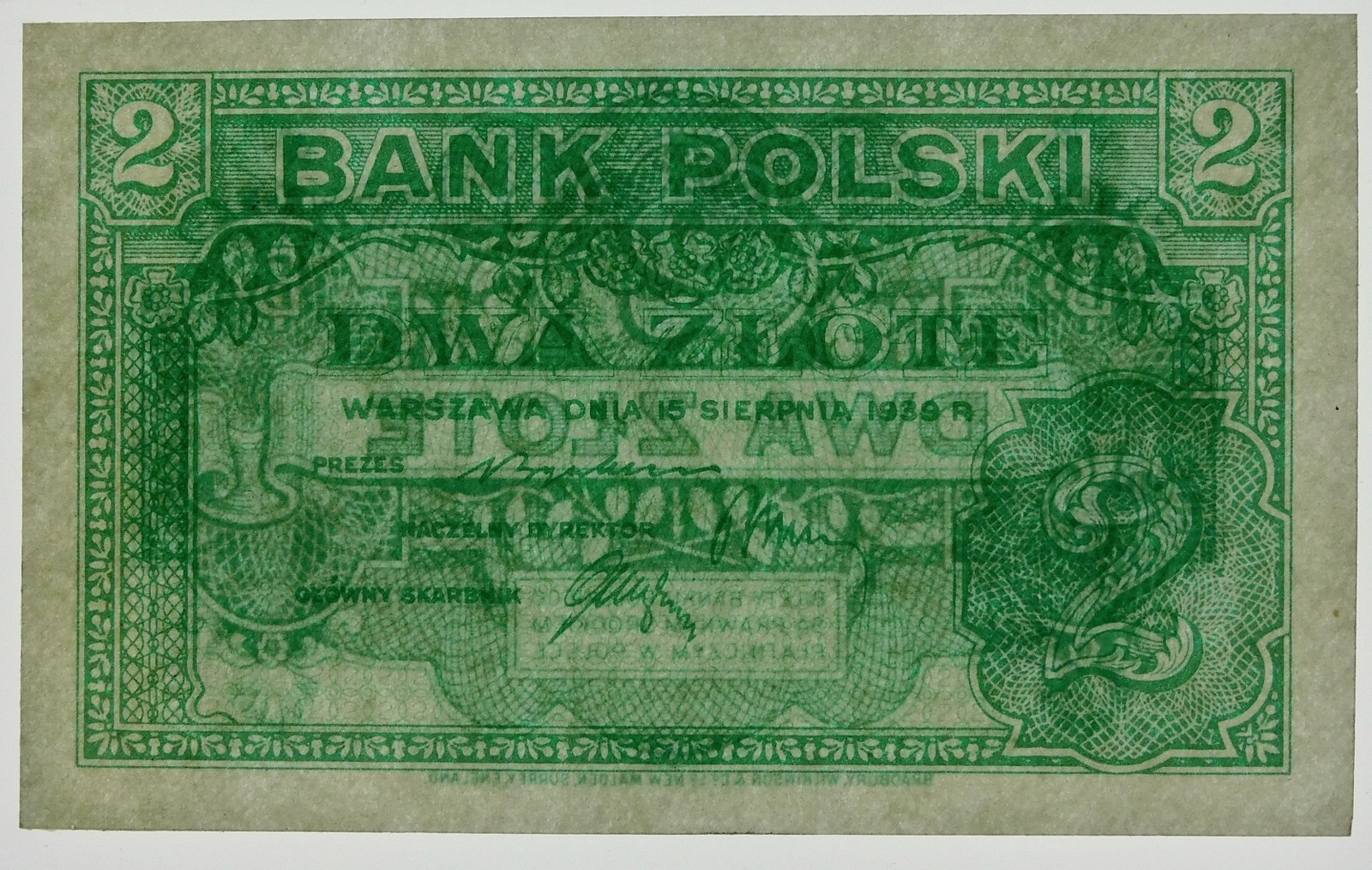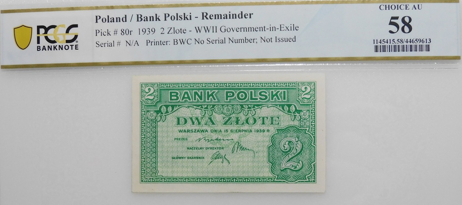 Banknot 2 złote 1939, tzw. emisji emigracyjnej (druk TDLR Londyn).