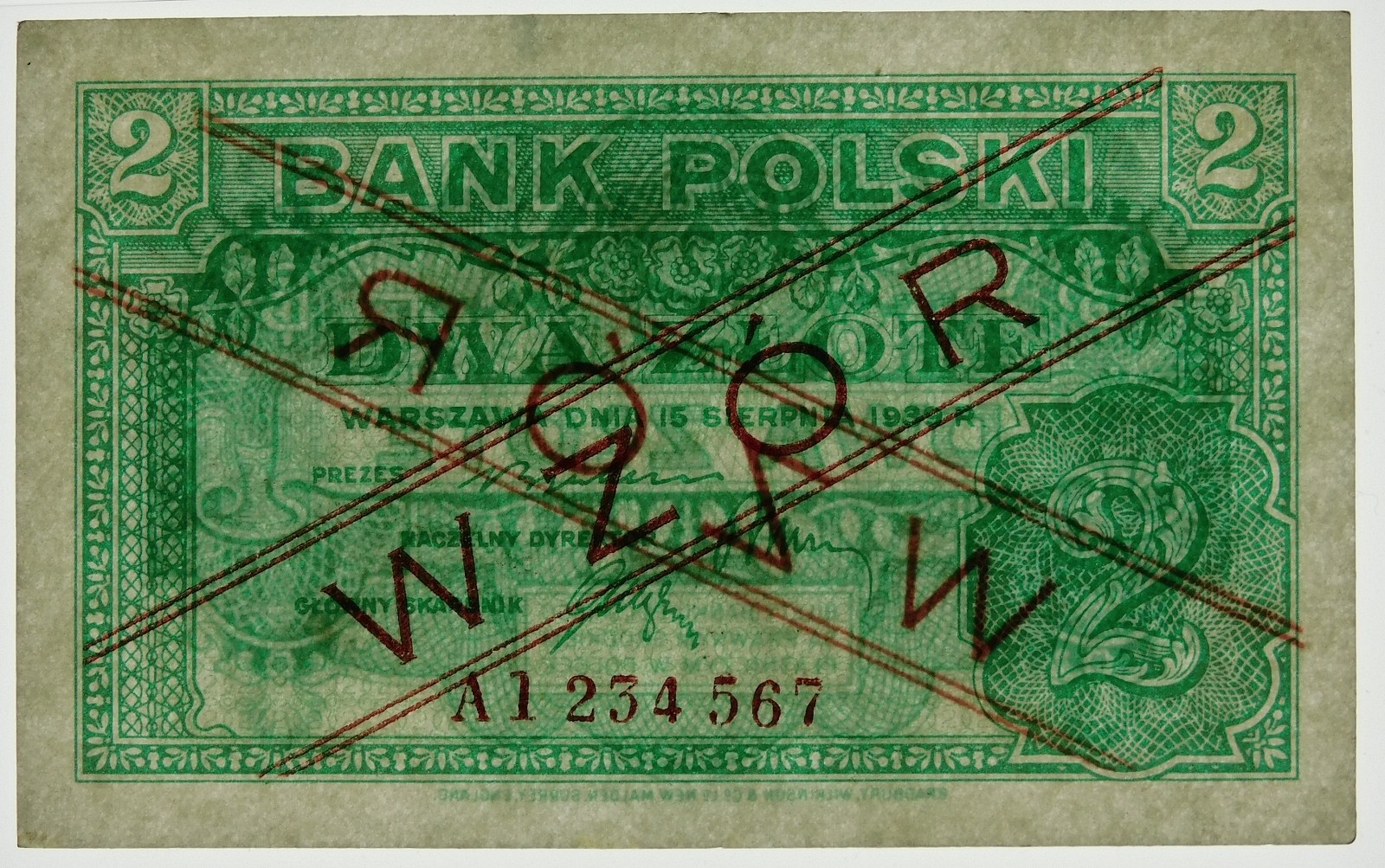 Banknot 2 złote 1939 WZÓR - ser. A , numeracja kolejna: 1 234 567