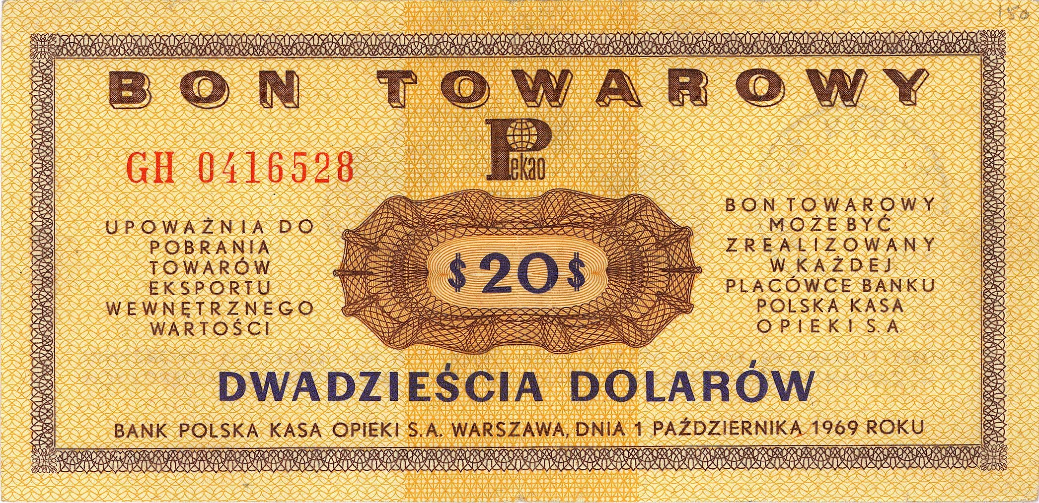 Bony towarowe Banku Polska Kasa Opieki S.A. 1960-1979, 20 dolarów 1.10.1969, seria GH, Miłczak B21b
