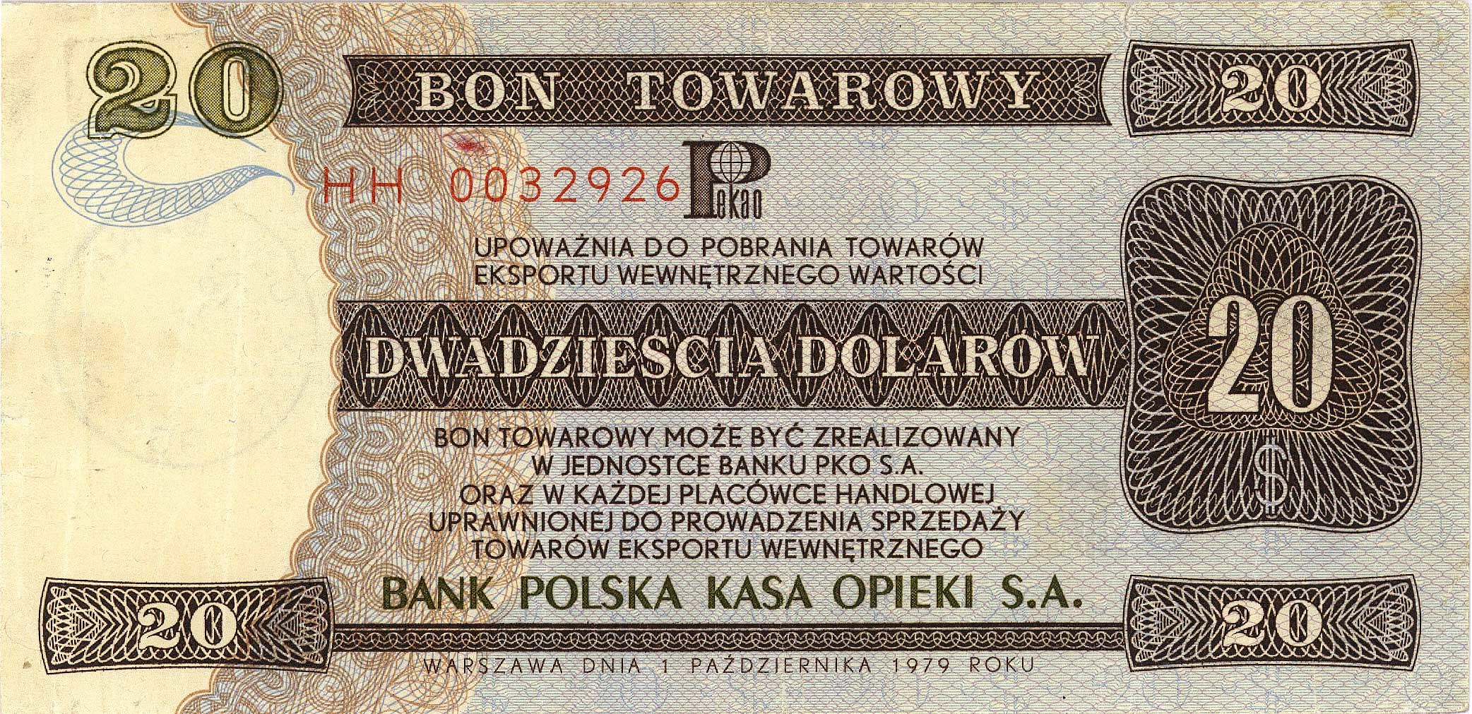 Bony towarowe Banku Polska Kasa Opieki S.A. 1960-1979, 20 dolarów 1.10.1979, seria HH 0032926, Miłczak B34
