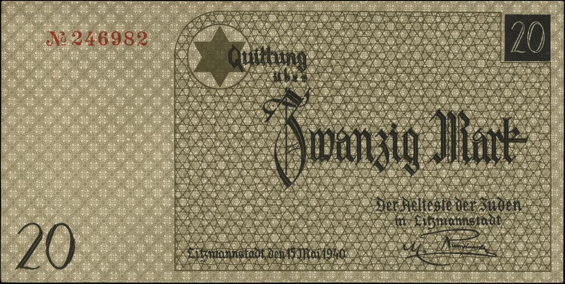 Getto Łódzkie 1940-1944, 20 marek 15.05.1940, numeracja 246982, papier bez znaku wodnego, Lucow 866 (R3) - ilustrowane w katalogu kolekcji, Miłczak’05 Ł6c, Miłczak’12 L6c, Campbell 4206a1, pięknie zachowane