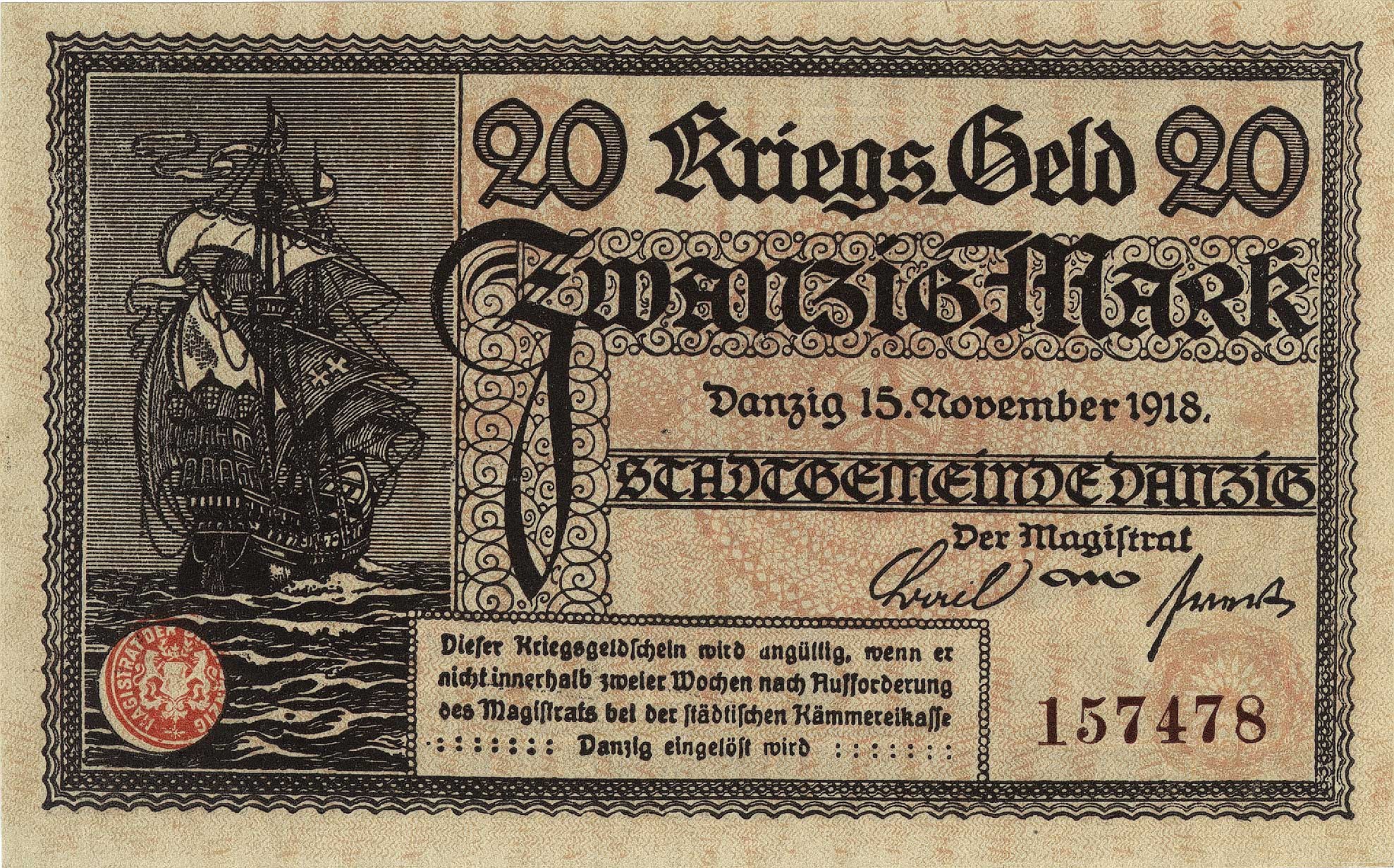 Wolne Miasto Gdańsk 1922-1938, 20 marek 15.11.1918, Geiger 090.07, Ros. 789, na odwrocie stempel Ungültig