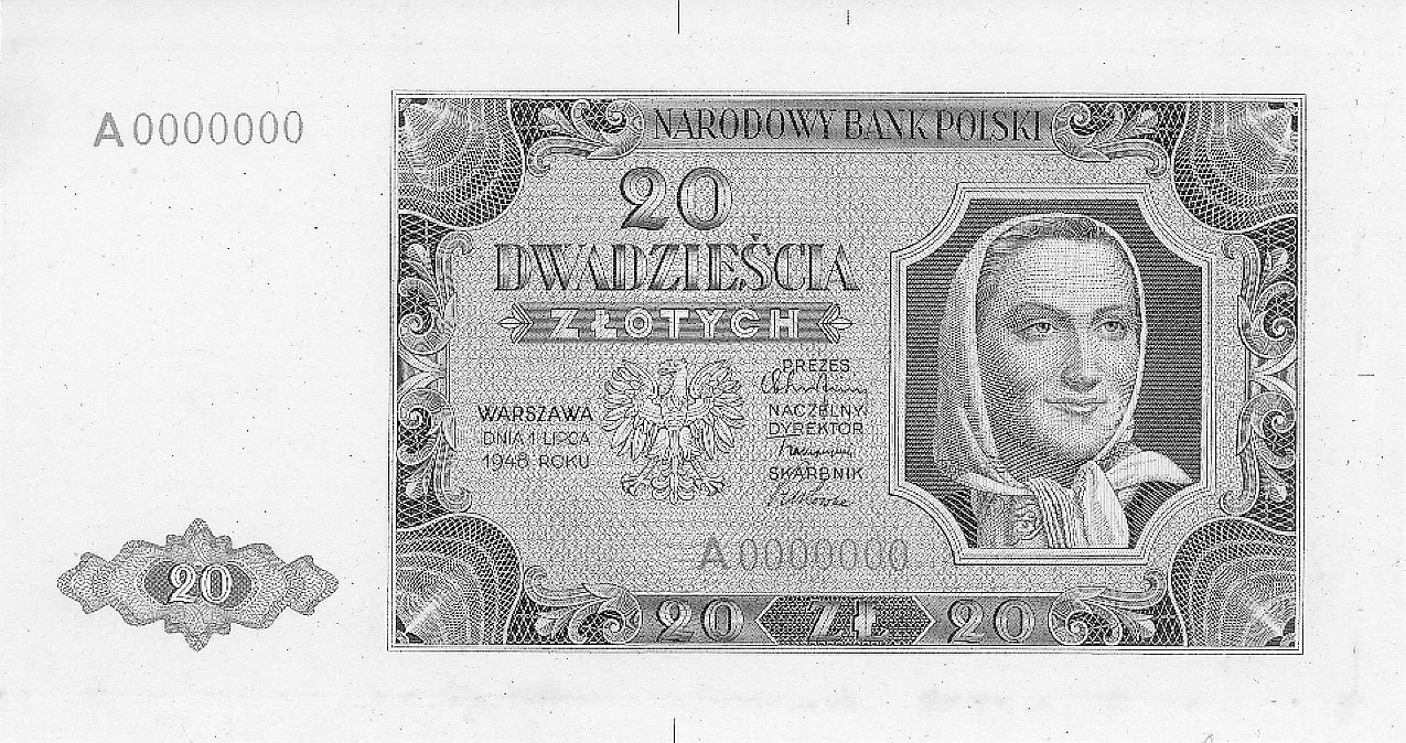 Banknoty powojenne, 20 złotych 1.07.1948, A0000000, /strona przednia i odwrotna oddzielnie, papier bez znaków wodnych/, Pick 137