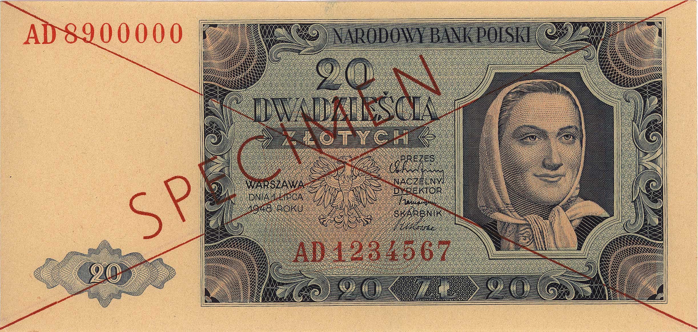20 złotych 1.07.1948, seria AD 1234567, AD 8900000, SPE...